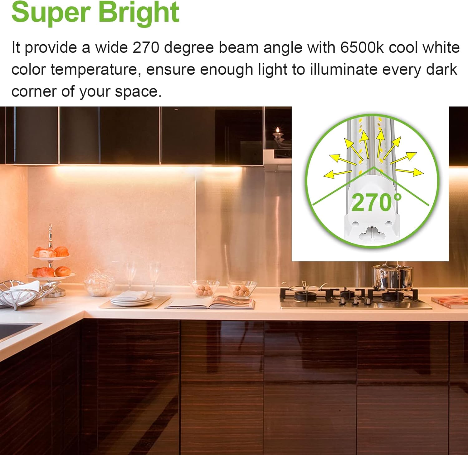 - 【Super Bright】 - V-shape designed T8 shop light provide a wide 270 degree beam angle, double row LED chips also ensure enough light to illuminate every dark corner of your space.