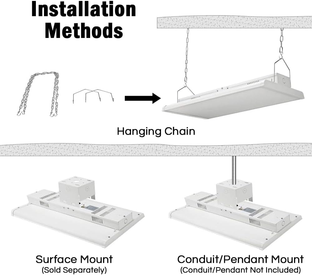 - đź’ˇ Easy Installation - No Bulbs and No Maintenance Ever! Plug and play installation can be done in minutes and accepts multiple voltages from 120-277V AC. It has half inch knockout holes for installation of accessory sensors or NPT. Surface and Pendant Mount Kit available by searching ASIN B08FZQ9961.