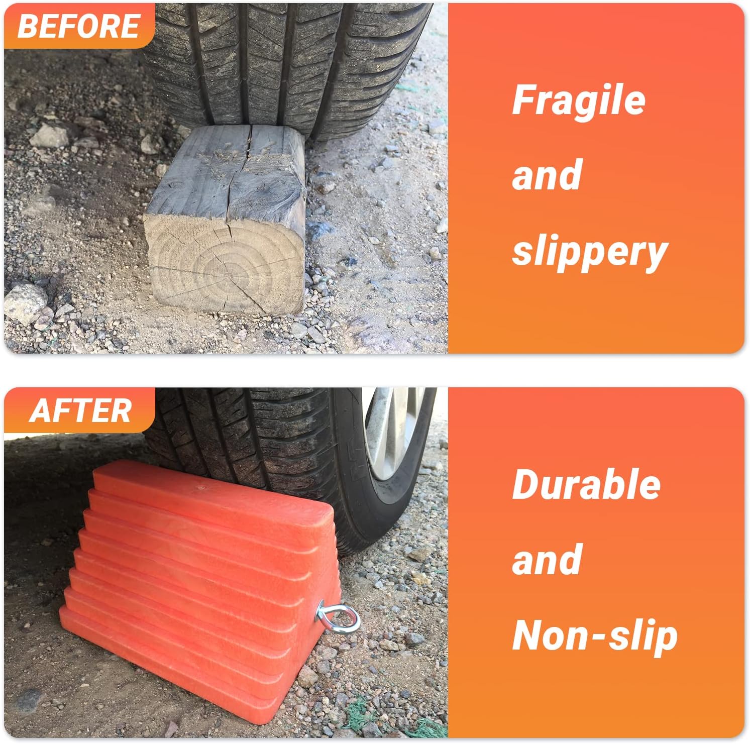 - Ideal Choice: This wheel chocks breaks the conventional black, using the orange series is more eye-catching can keep your vehicle or trailer secure at any time, durable and stylish, is the best choice for wheel chock. Includes 2 Pack; Dimensions: 9.1" x 7.1" x 5.5"