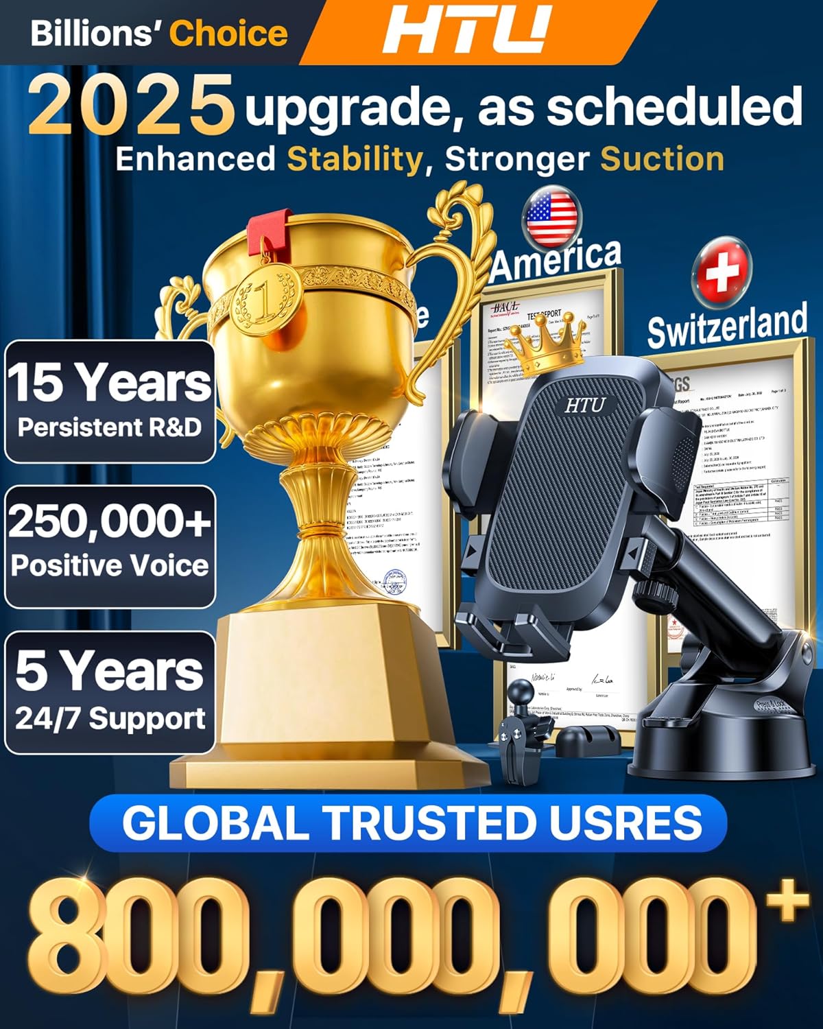 HTU [True Military-Grade] 2025 Upgraded Car Phone Holder 【Safety Certs & No Smell】 Cell Phone Holder for Car Mount for Dashboard Windshield Air Vent Long Arm Thick Case,Black