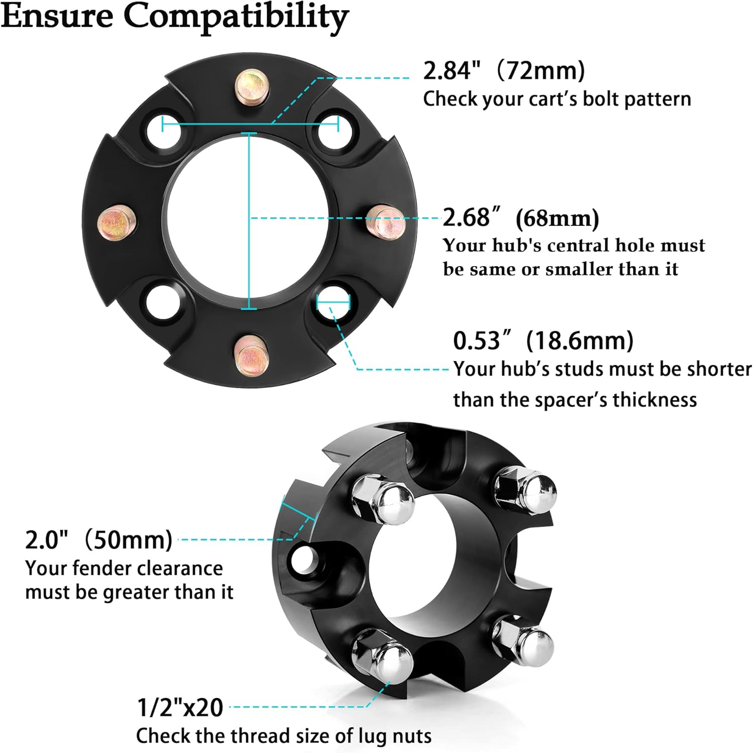 10L0L Golf Cart 2 inch Wheel Spacers for Yamaha, EZGO, Club Car (4x72mm Bolt Pattern, 68mm Hub Bore, 1/2-20 Studs) 4 Pack, Black
