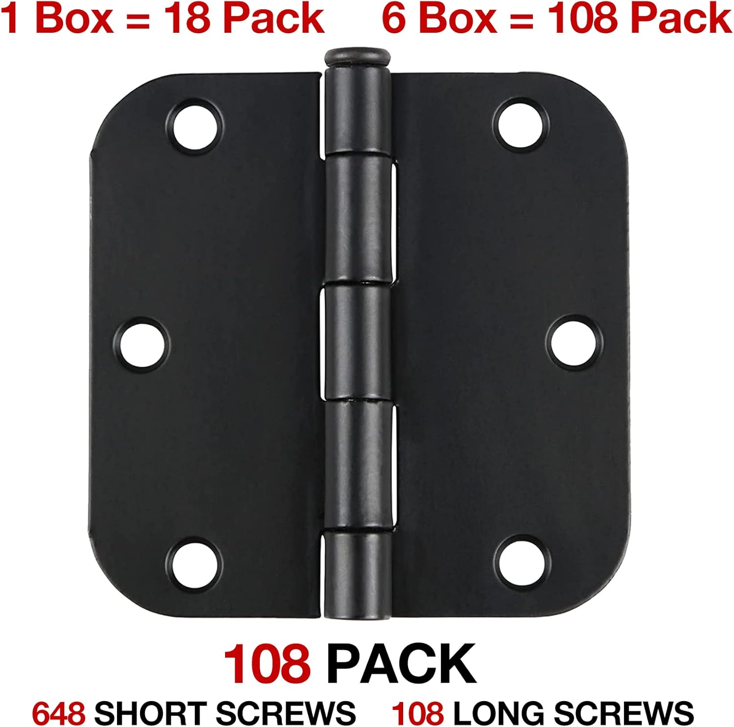 108 Pack Rounded Matte Black Door Hinges 3.5 Inch 5/8" Radius for Interior 3 1/2" Flat Iron Bifold Residential Standard Hinge Bedroom Indoor for Doors 3 ½"Hardware Heavy Duty Steel Regular Home Kit