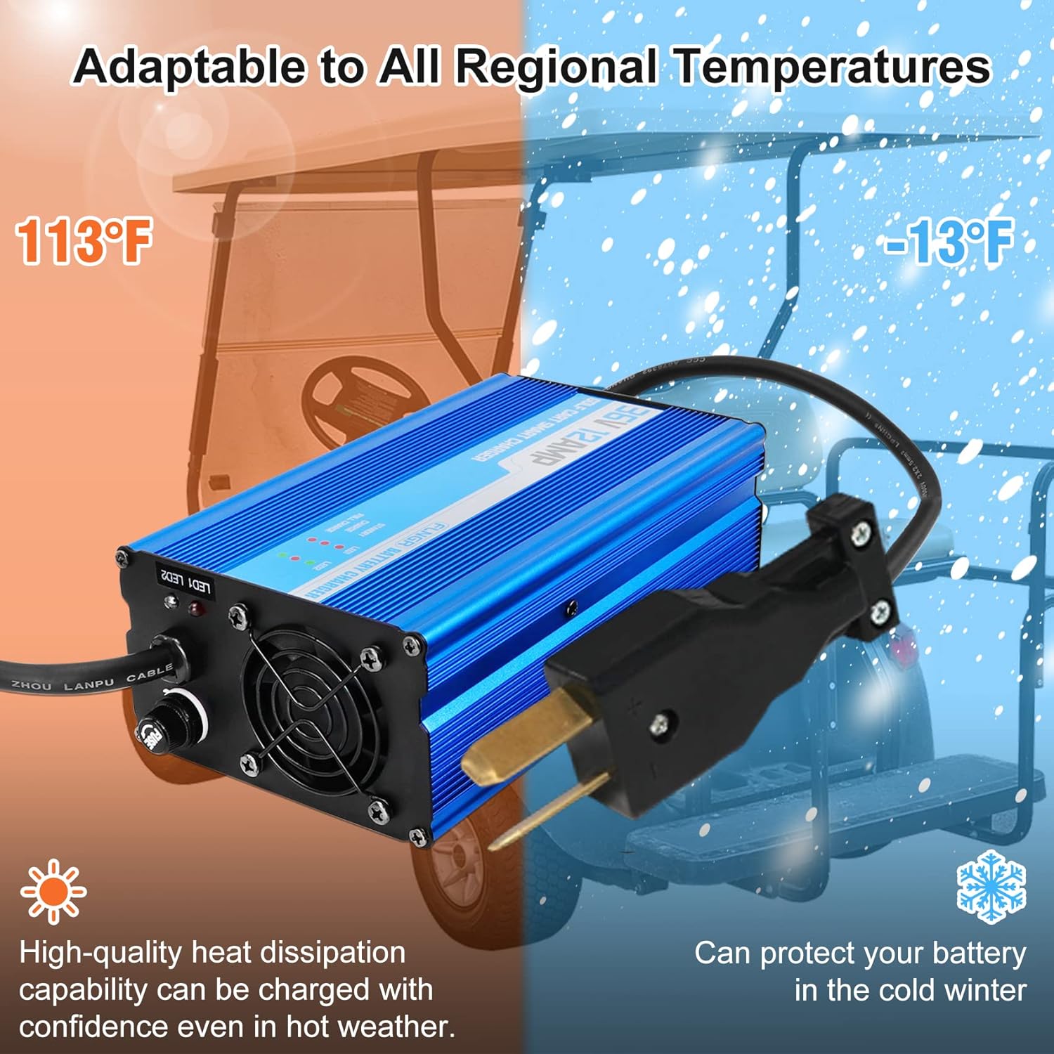 - 【Battery Protection】 36 volt golf cart charger will adjust the charging power according to the battery level to protect your battery. When charging is abnormal, the fuse of the charger will automatically disconnect to stop charging. Just replace the fuse to keep the charger working