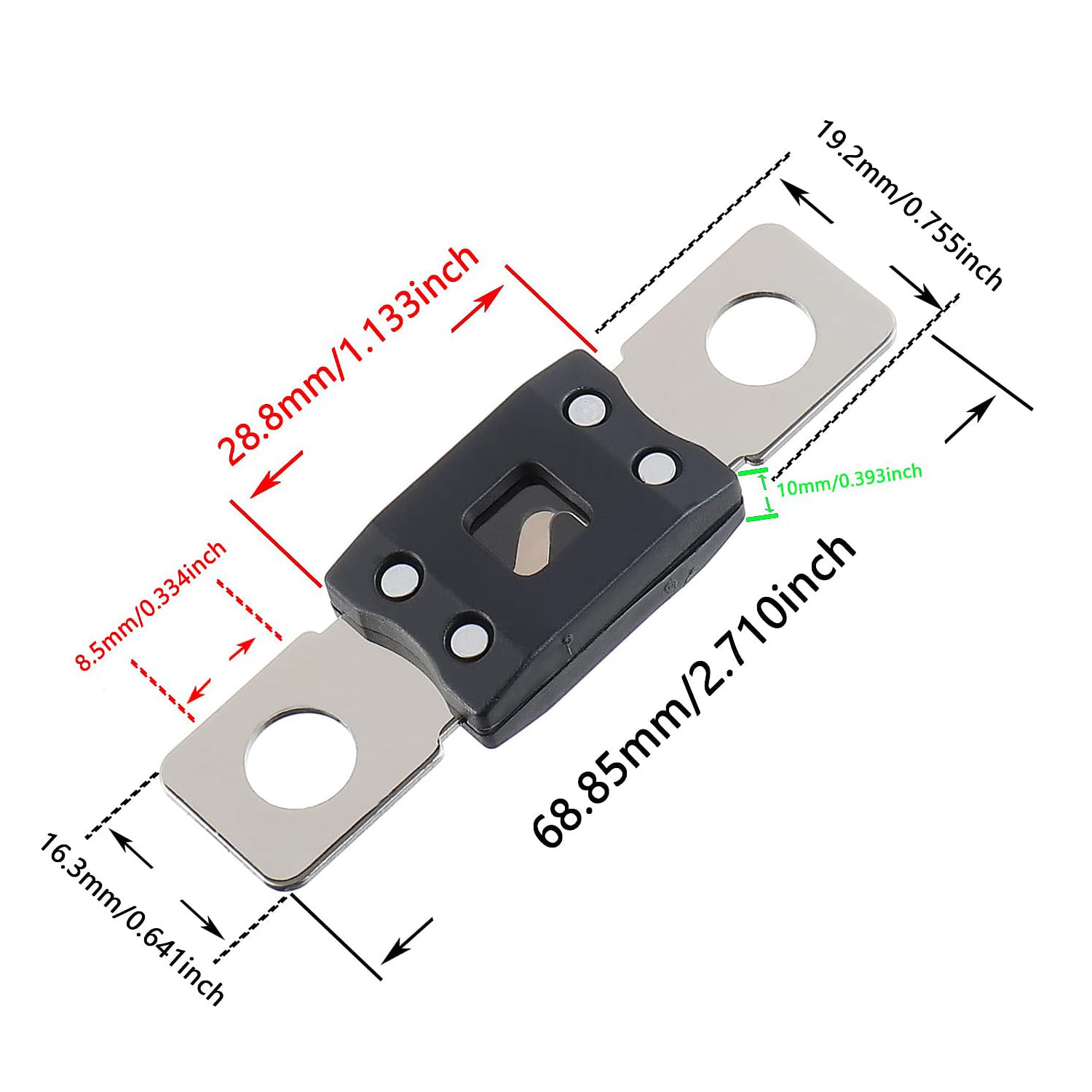 - Dimensions: 68.85 x 19.2 x 10 mm (L*W*H); Hole Spacing: 50.8mm; Hole Diameter: 8.5mm (M8)