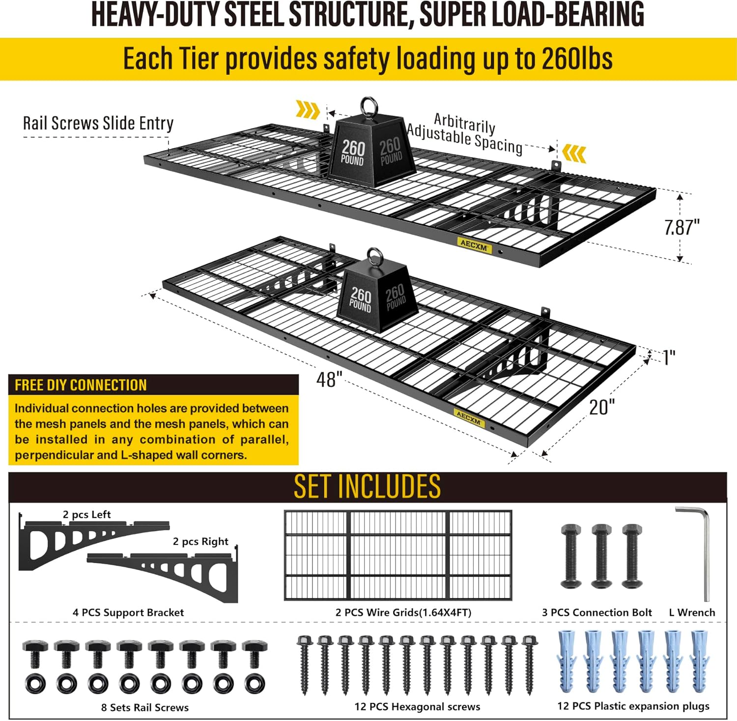 - 560lbs Load Tested: Our garage wall shelves undergo rigorous testing, with each individual unit supporting 280 lbs. The 2-pack (1.64x4ft) offers a total weight capacity of 560 lbs