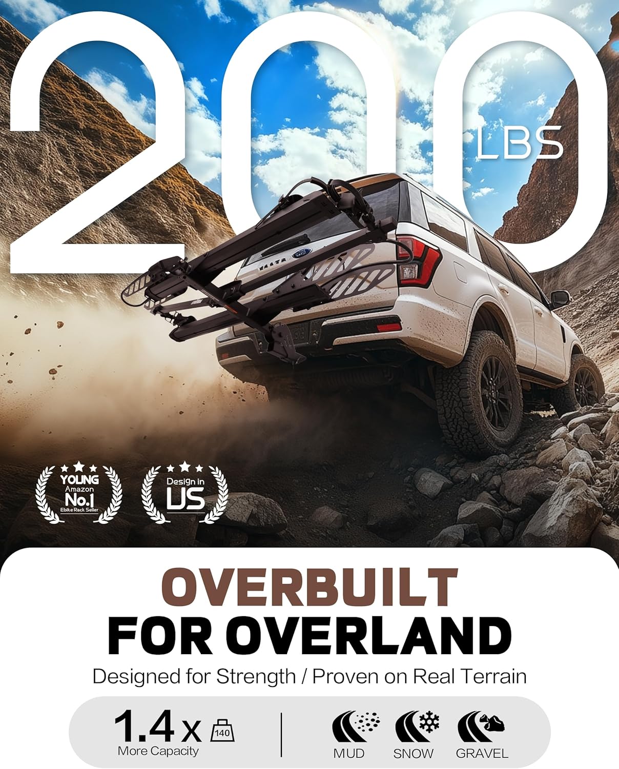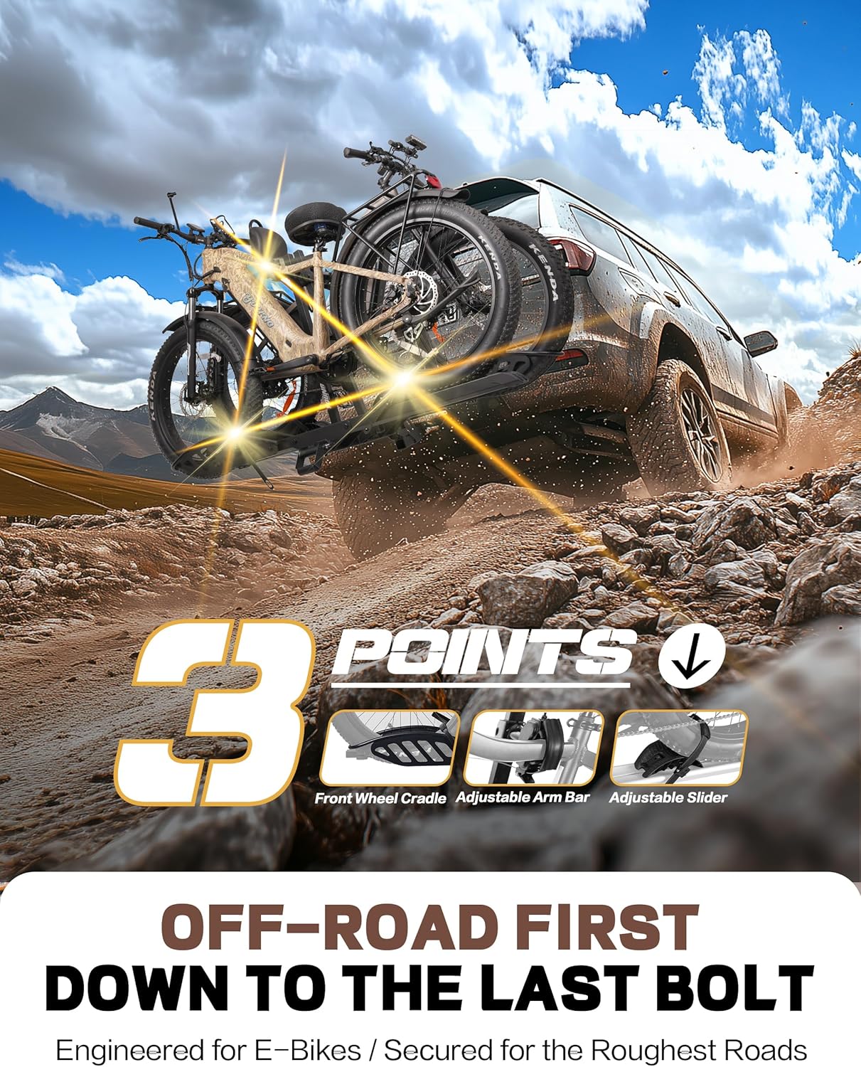 - SECURE YOUR BIKE FROM WOBBLING: Our electric bike rack features a patented front wheel cradle (Better & deeper wrapping), providing unparalleled stability and resistance to vertical sway. The support rod needs to be tightened to 50Nm torque (Approved for off-road use), it ensures your bikes stay securely in place, even during bumpy rides. With anti-loosening bolts, you can rest assured that your bikes are safe and sound throughout the journey.