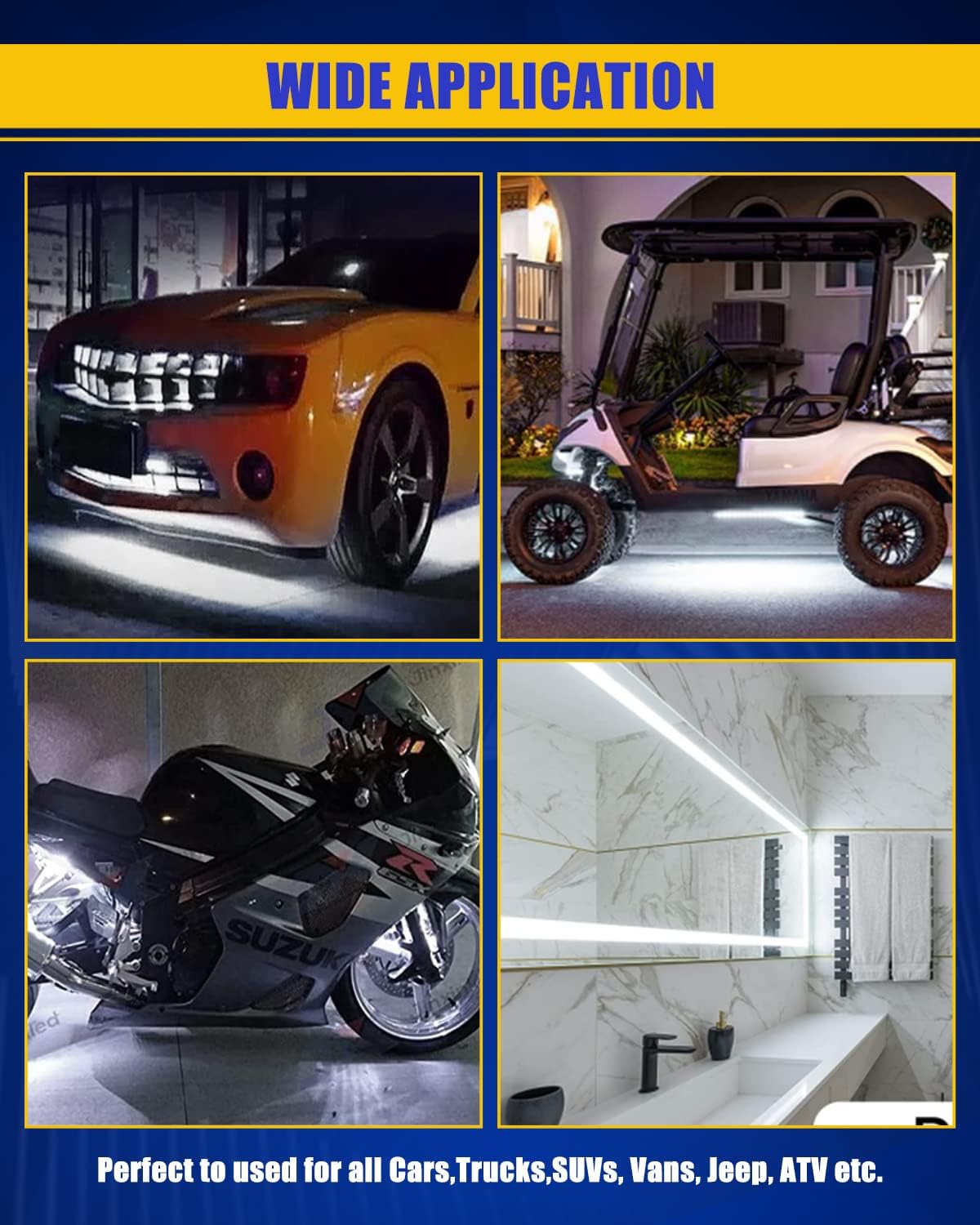 - 【Flexible and Cuttable】Our golf cart lights can be cut every 3 LEDs to your required length,flexible and ultra thin, can be easily installed in between the gap and virtually invisible.