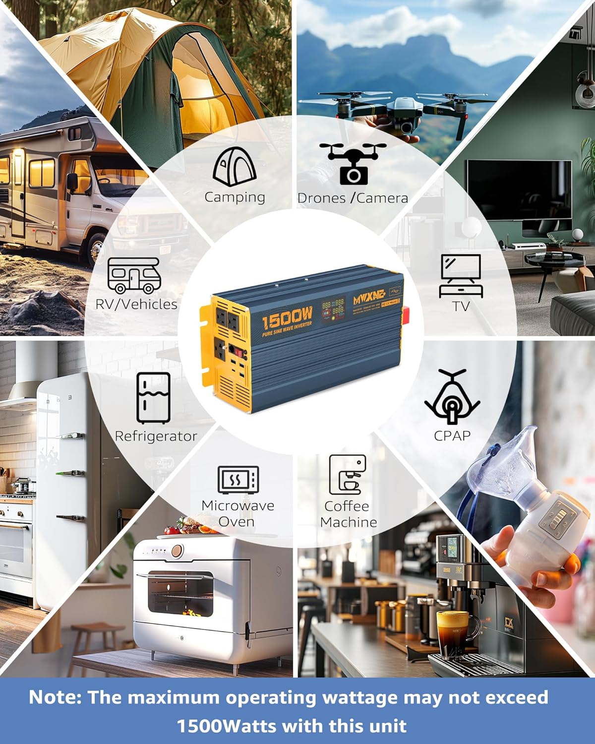 - 【FAST CHARGING USB PORTS】MWXNE Upgrade fully 1500 Watt Power Inverter converts 12V DC to 110V 120V AC with 3 AC outlets, 2 18W USB-A ports,a 24W USB-A port and 60W USB-C(TYPE-C) PD port for fast charging. 4 USB ports can power multiple devices at the same time.It is convenient for you to use in various environments and share with your family and friends.
