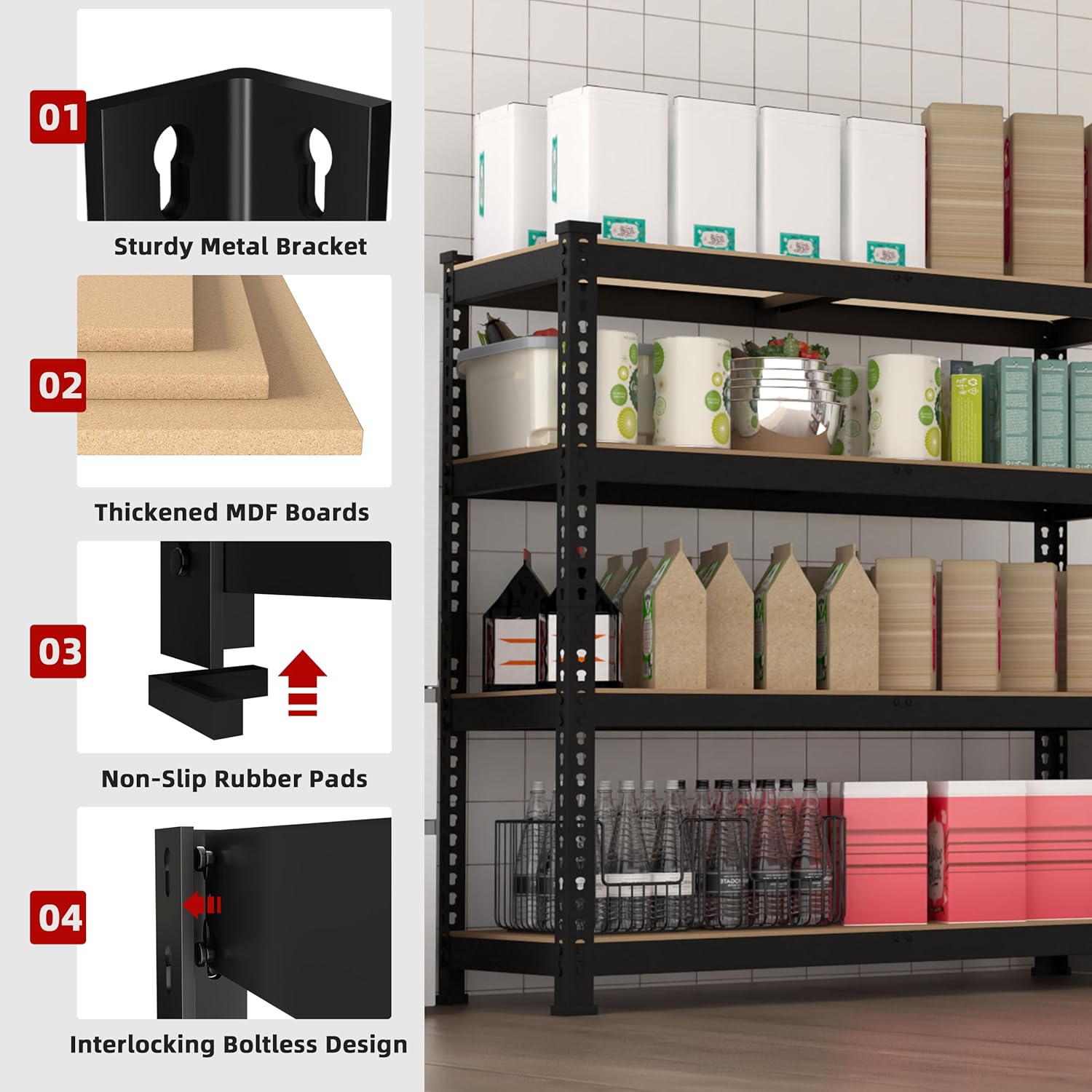 - - Endless versatility: The 4-tier shelves on this heavy-duty storage unit are adjustable, allowing you to customize the unit to fit the size and shape of any item you need to store. It’s perfect for organizing your space, such as the garage, warehouse, basement, pantry, kitchen, living room, shed, laundry, closet, office, etc