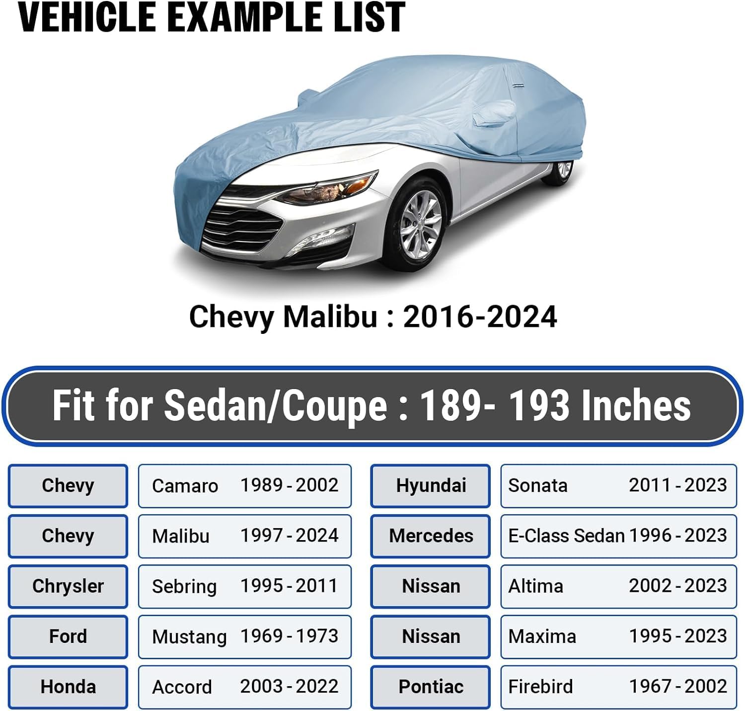 - Perfect Fit: Tailored for vehicles measuring 189-193 inches, such as Chevy Camaro, Honda Accord, Hyundai Sonata, Nissan Altima/Maxima, and Pontiac Firebird. Experience a snug fit with our portable, full exterior covers. Suitable for sedans, coupes, convertibles, and hatchbacks.