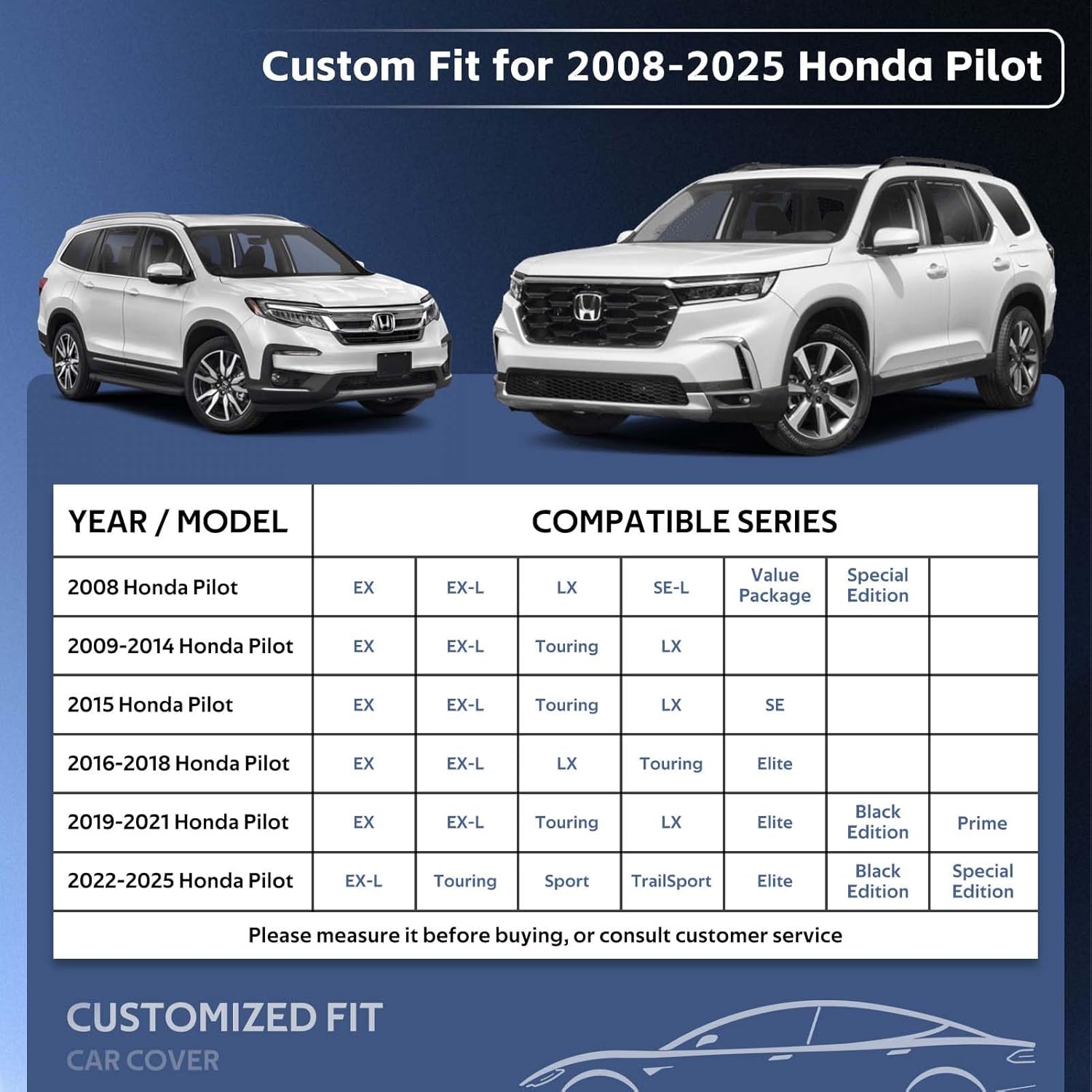 - ăPerfect Fităâ Holthly has conducted experiments to obtain a customized car cover specifically designed for Honda Pilot (2008-2024). The custom-like fit of the full cover not only enhances the -aesthetics of your vehicle but also provides superior wind resistance, thereby prolonging the lifespan of the hood. It offers enhanced and long-lasting protection for your car.
