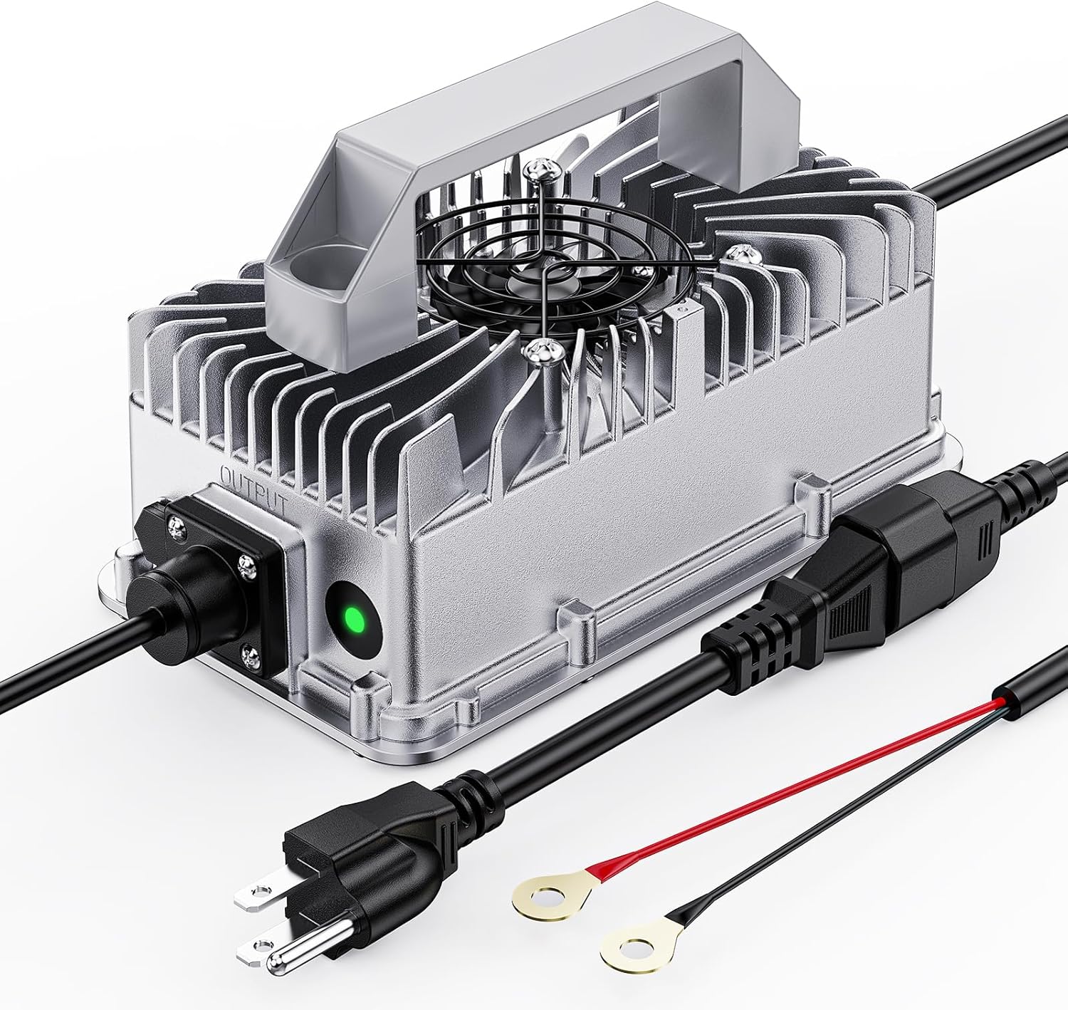 - 【Waterproof and Dustproof Aluminum Die-casting Shell】: The shell is made of aluminum die-casting, the charger is filled with AB glue to protect and cool down the main board and components. The waterproof and dustproof rating of the LifePO4 battery charger is IP66, the AC cable length of 9.8 feet, the DC cable length of 5 feet. It comes with a comfortable handle grip, making it very easy to carry!