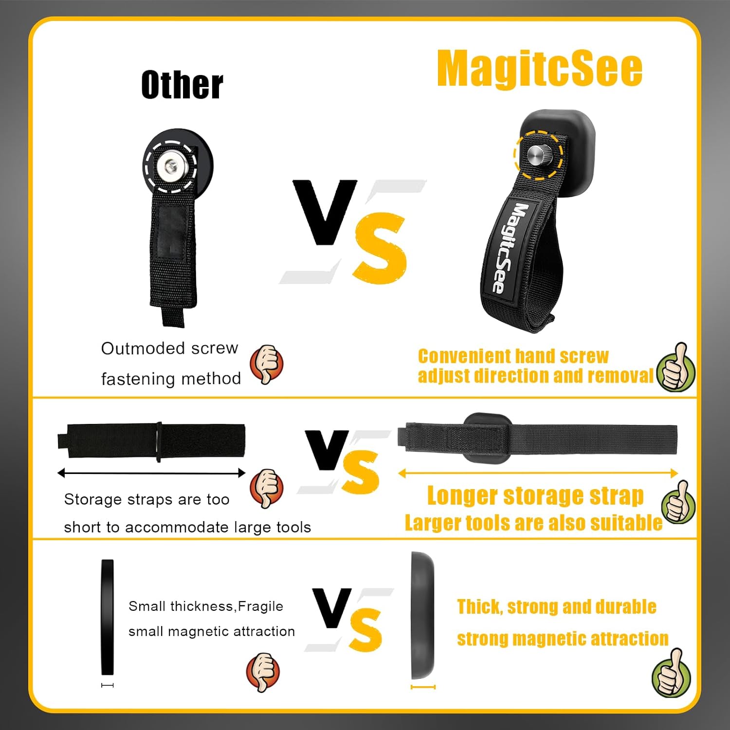 - Cable Management: Magnetic hooks come with high-density nylon storage straps featuring adjustable perimeters to store up to 4.2" diameter objects. Perfect for organizing extension cords, charging cables, garden hoses, and power tools.