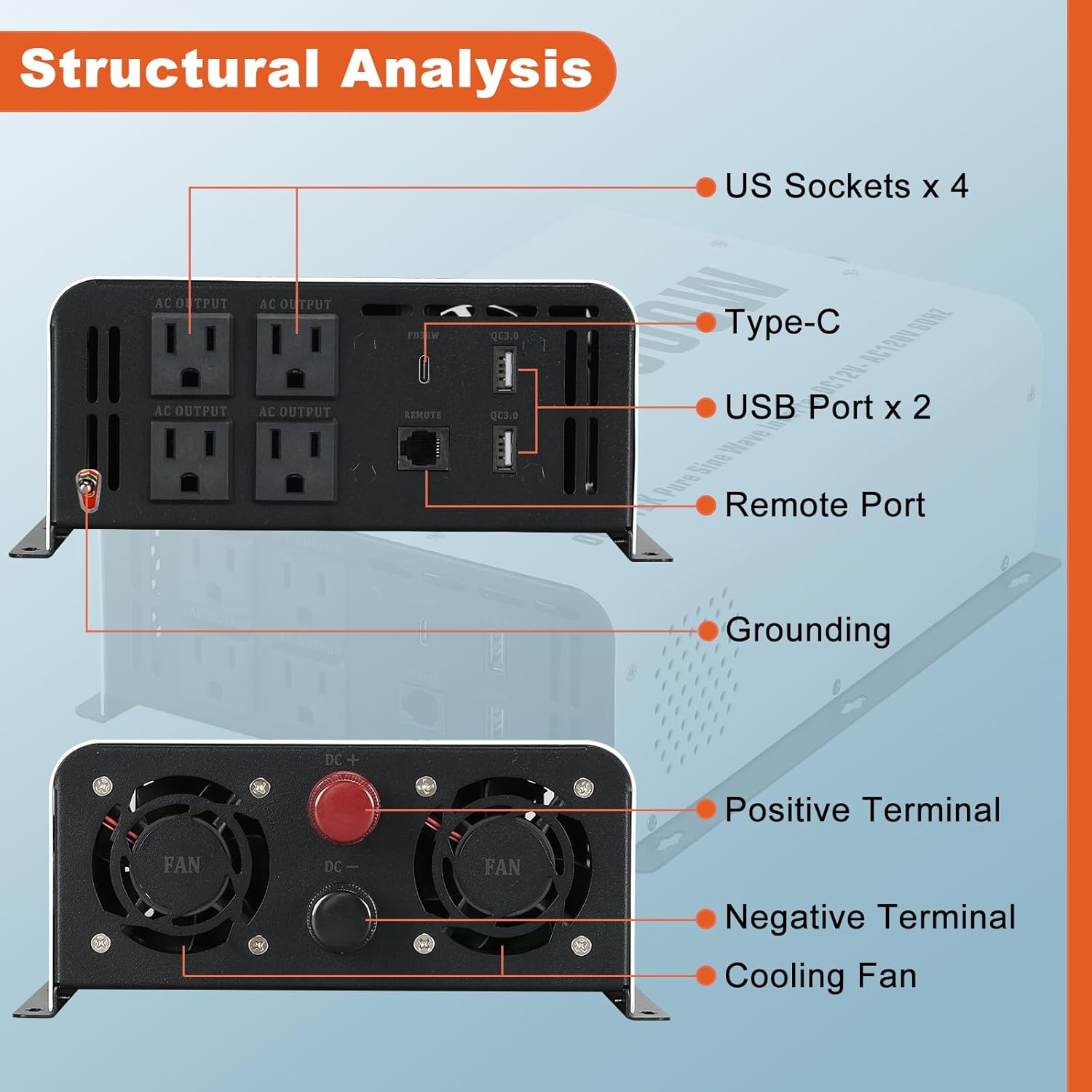 - Smart Cooling and Advanced Protection: This 12V power inverter integrates smart cooling fans that control based on temperature and load control. With built-in multi-protection features, such as over load, low voltage, over temperature, over load and short circuit protection, this inverter ensures the safety of your connected devices.