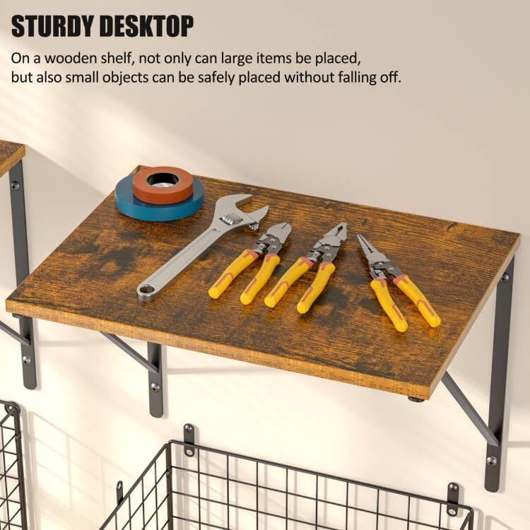 - Large Storage Capacity: The package includes 2 shelves, 2 wire baskets, 1 hook rack. This unique storage combination has a large enough capacity to store a lot of garage supplies. Making full use of this wall shelves capacity to make your home look cleaner and tidier.