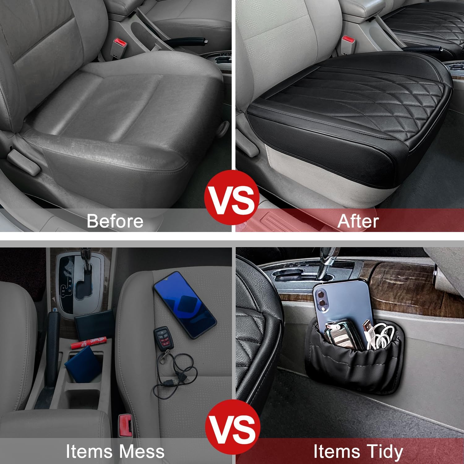 2 Pack Leather Front Car Seat Cover Bottom Car Seat, Universal Anti-Slip Driver Car Seat Protectors with Storage Pocket, Waterproof Bottom Auto Seat Cushion Pad Mat for Most Vehicles(Black)