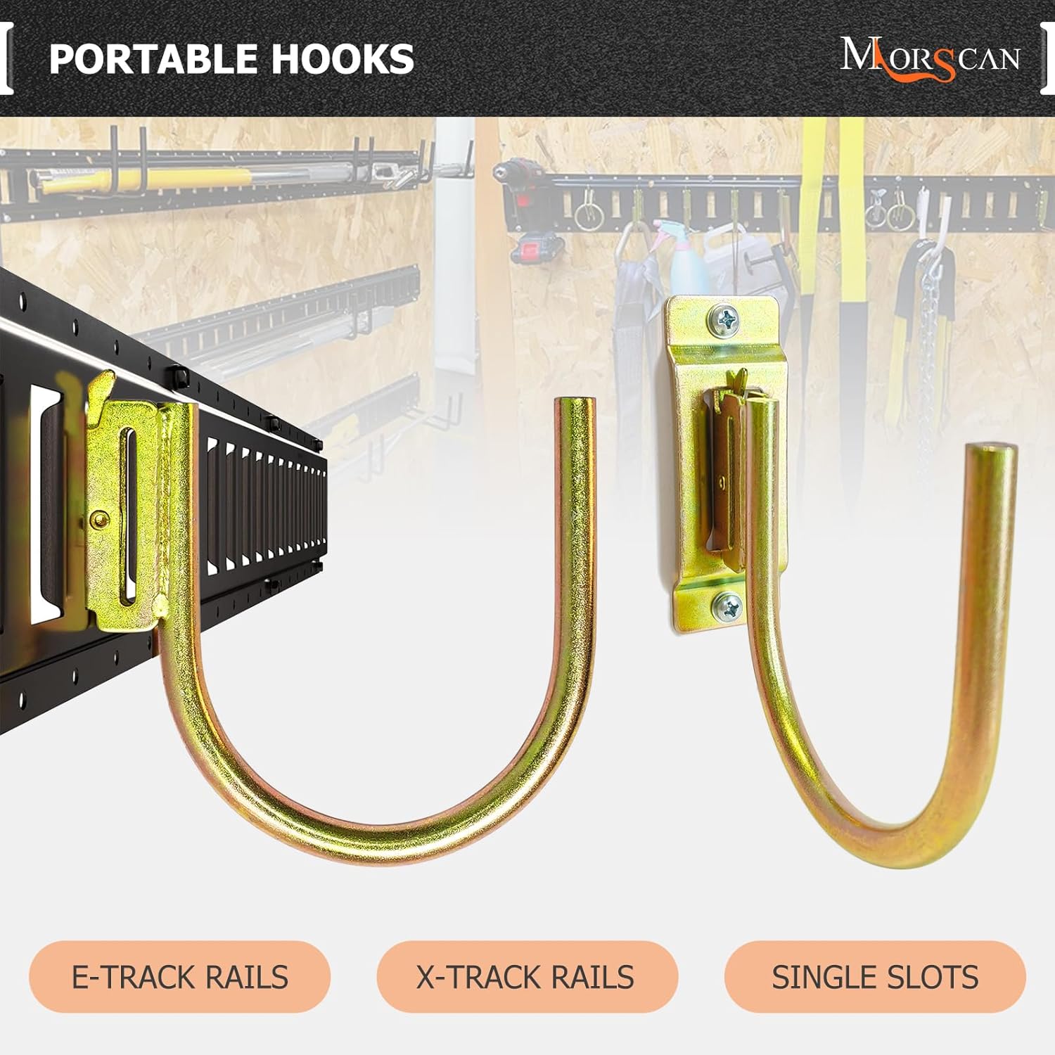 - HEAVY DUTY HOOKS - Strong hooks fit for all E Track/X Track trailer tie-down rails or E port single slots. With 4" inner clearance, 500 pound working load limit, 1,400 pound break strength.