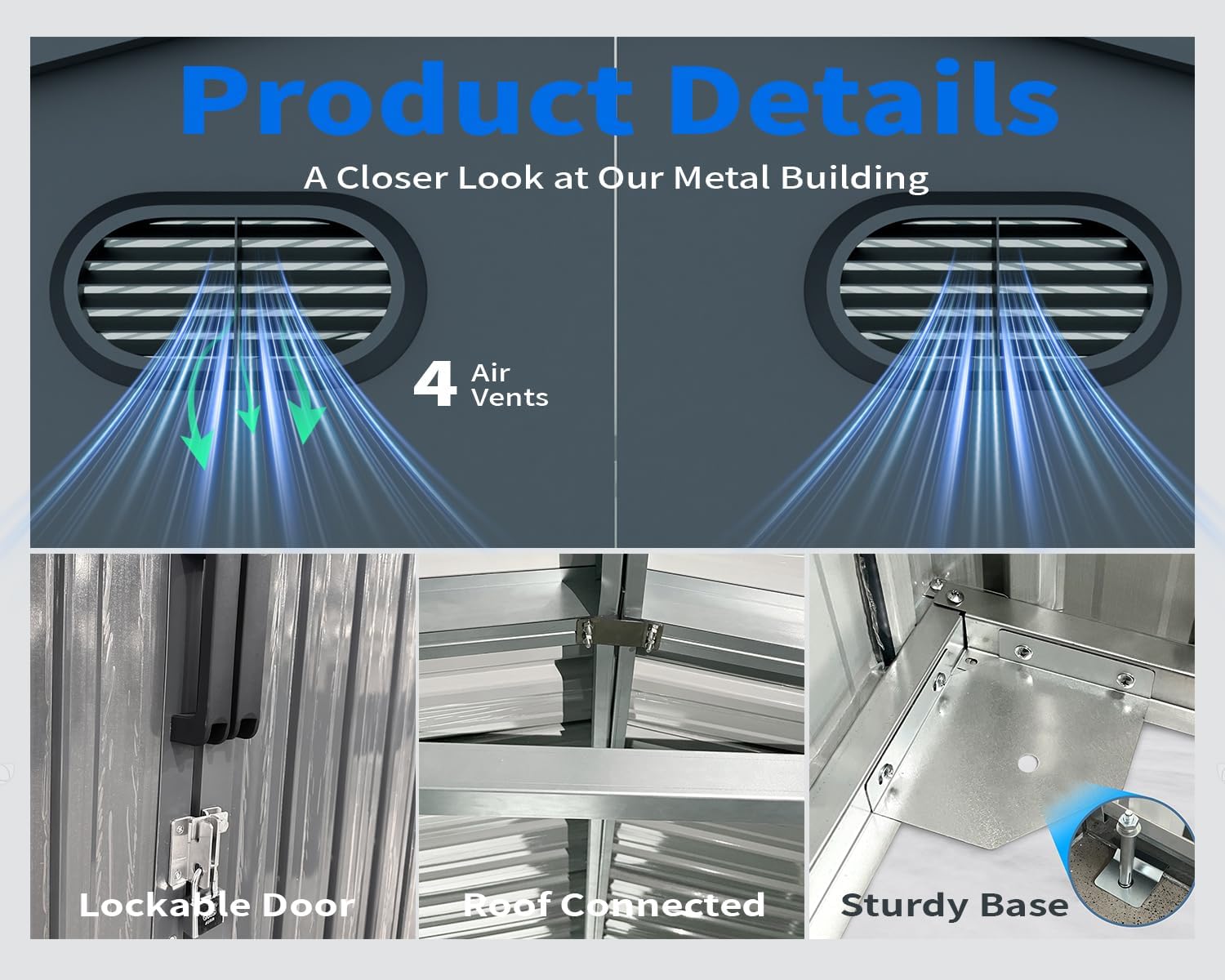 - ๐ก๐๐ฅ๐ฅ-๐ฐ๐๐๐ญ๐ก๐๐ซ ๐๐๐ญ๐๐ฅ ๐๐ก๐๐: This large shed 10x20 is waterproof with a sloped roof, effectively preventing leakage or accumulation from heavy rain or snow. It features 4 vents for improved air circulation, keeping your tools in good condition. The sloping roof and lockable door also help prevent odors and reduce moisture. With a lockable design, this garage building provides hidden storage space.