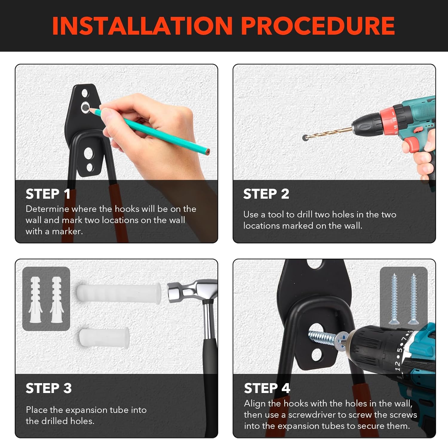 - 5. Garage Organizer: When purchasing our Heavy Duty Garage Hooks, you'll receive 2 heavy-duty hooks, 4 reinforced wall anchors, and 4 corrosion-resistant screws. Effortlessly transform your space by maximizing vertical storage capacity, clearing floor clutter, and establishing a streamlined organizational system.