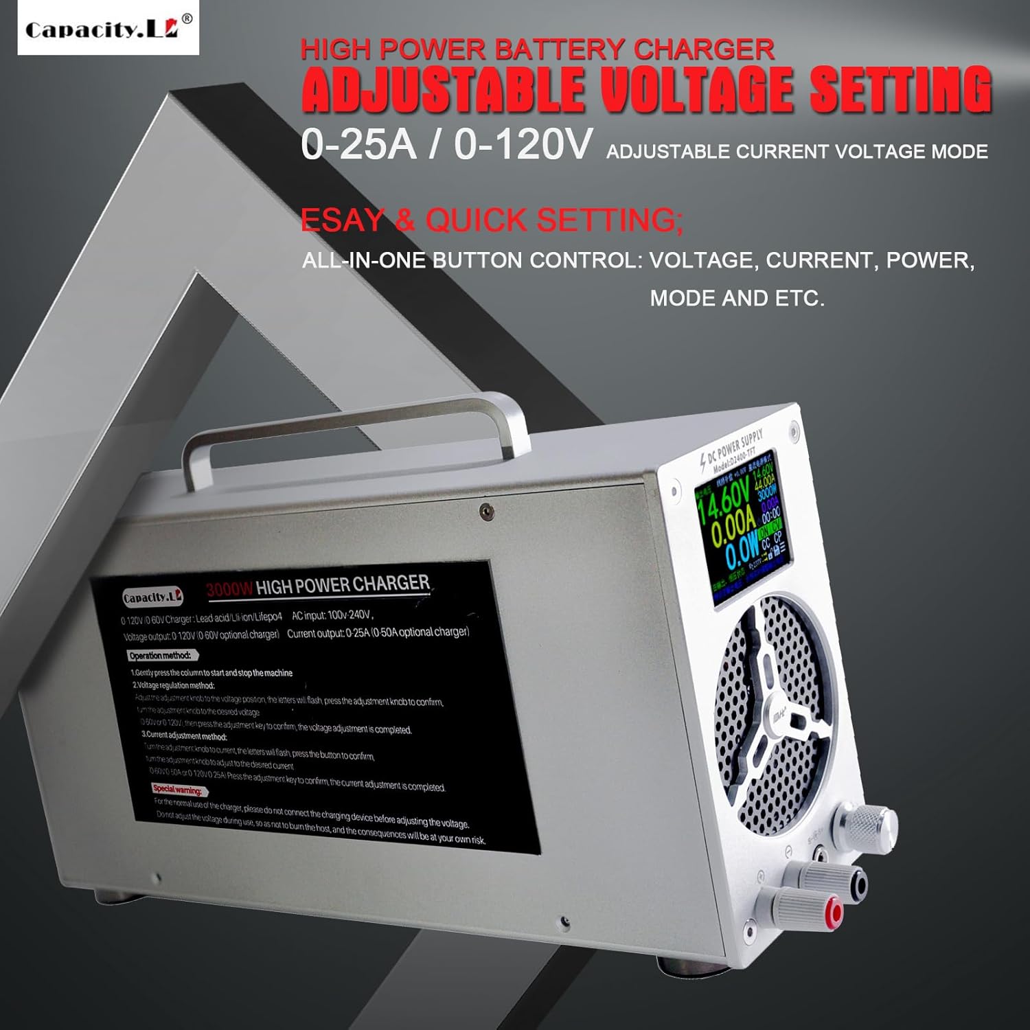 - EASY TO CONTROL & DUAL SCREEN DIGITAL DISPLAY: High power lifePO4 battery charger with adjustable voltage 0-120V & current 0-25A, Multi modes are all in one control switch, easy to control charging. Equipped with a dual screen digital display design, accurate to the last two decimal places, more precise, clear, and convenient for adjustment and viewing.