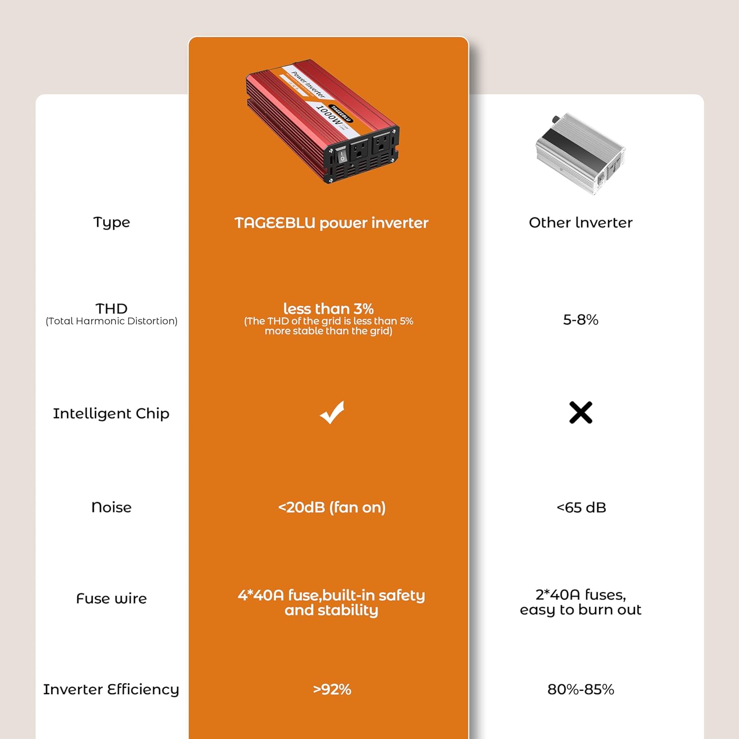 - 【Powerful output】The TAGEEBLU Power Inverter offers a continuous DC to AC power supply of 1000W, converts 12V DC battery power to standard 110V AC, with a peak surge of 2000W during load startup. Conversion efficiency > 92%. It employs advanced high-frequency transformers and features 100% pure copper ultra-flexible cables, ensuring a high level of safety during use