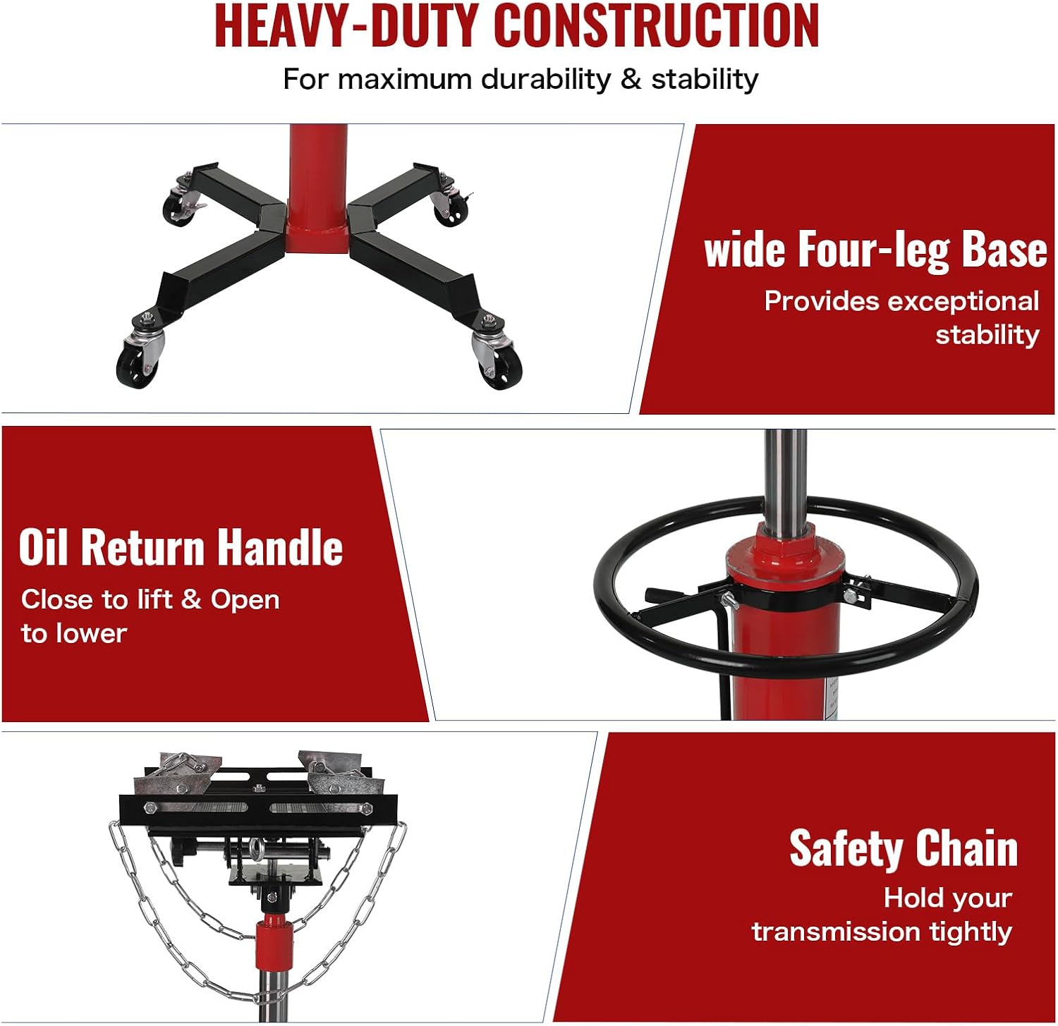 - 1100 LBS LOAD CAPACITY - JustSmart Hydraulic transmission jack is constructed from high quality carbon steel, and the wide base ensures stability, while two heavy-duty safety anchor chains are specially designed to hold the load securely in place. All of these help you easily and safely guide a transmission.