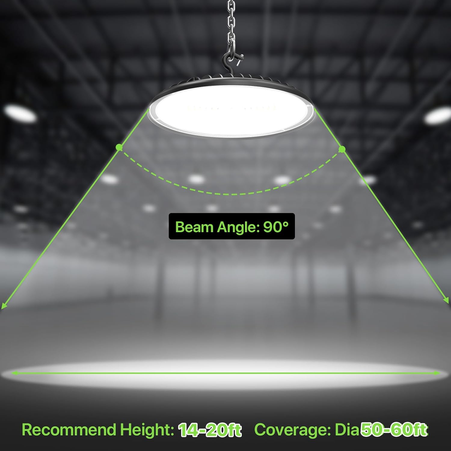 - Eyes Friendly Light Ouput: 5000K whitelight is closed to the natural lght, gentle and comfortable. 80+ CRI, you can see the real item color as much as possible. This high bay led light is glare and flicker free, without spots. You will not feel tired under the light even for a long time.