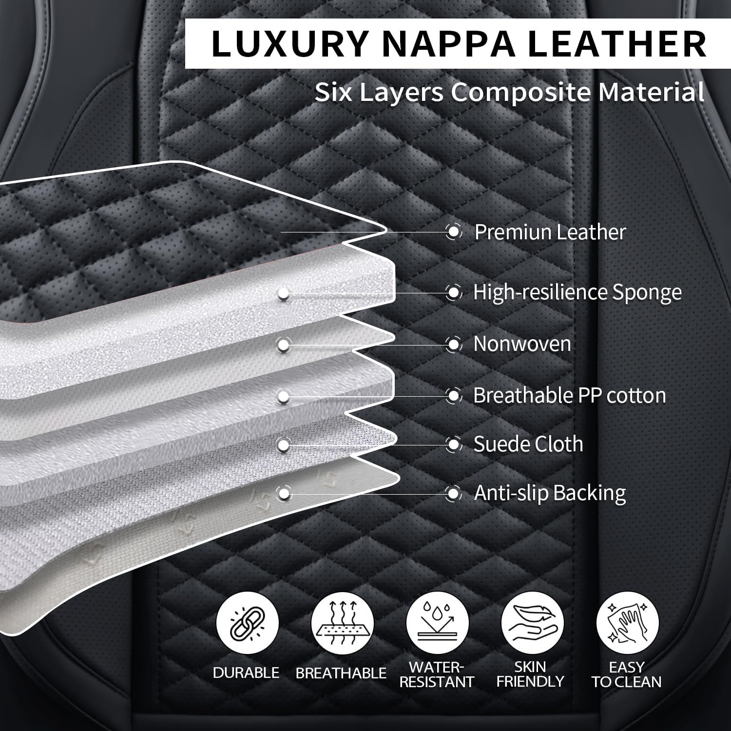 - HIGH QUALITY MATERIAL: Car seat covers is made of artificial leather filled with high elasticity sponge inside, soft and comfortable, which can enhance driving comfort.