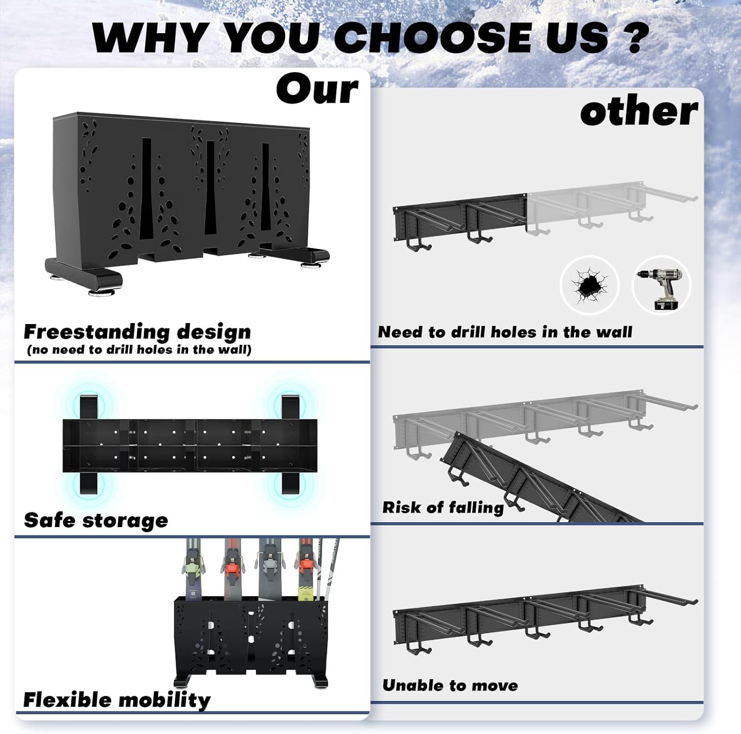 - Freestanding and Stable Design β With its sturdy, freestanding structure, this snowboard and ski rack remains stable even when fully loaded, providing a safe and reliable way to store your winter gear.