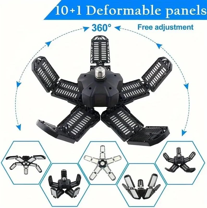 - 10+1Leaves Deformable Super Bright LED Garage Lights】- With 11 ultra-bright adjustable LED pannels. It features with 11*24 PCS top quality diodes that total 26000 lumens, CRI80+, 6500K daylight can give you 85% energy saving for your garage. The upgraded lighting fixtures have sufficient brightness and are the preferred choice for work.