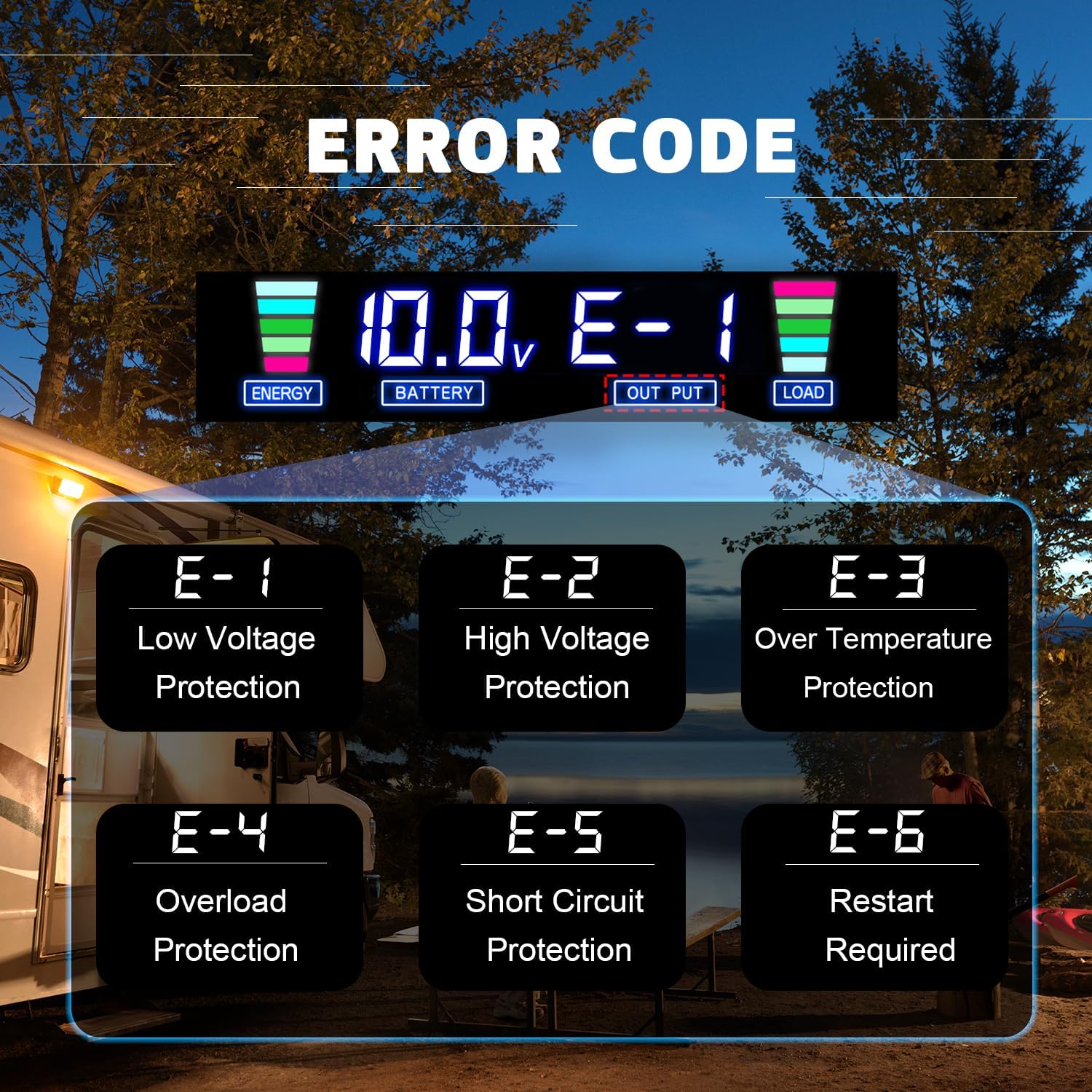 - INTELLIGENT LCD DISPLAY: In normal working state, the LCD Display will display the input/output voltage, battery capacity, load capacity and output frequency. When the inverter is in an abnormal state, the LCD Display will display the abnormal code. Such as, E-1: Low Voltage Protection, E-2: High Voltage Protection, E-3: Overtemperature Protection, E-4: Overload Protection, E-5: Short Circuit Protection, E-6: Repeated Faults Shutdown, Restart Required.
