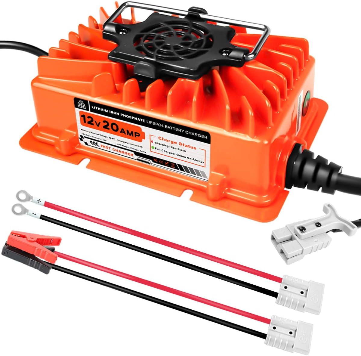 - 🚌【New 12V 20A Battery Charger】: It is 12V (14.6V) 20A LiFePO4 lithium battery charger, charging voltage: 14.6V, charging current: 20A, rated input voltage: 100V-240V AC; 50Hz to 60Hz. Meanwhile,newly designed aluminum body and large cooling fan with cover plate make the heat dissipation more efficient, reducing power waste and improving charging efficiency.