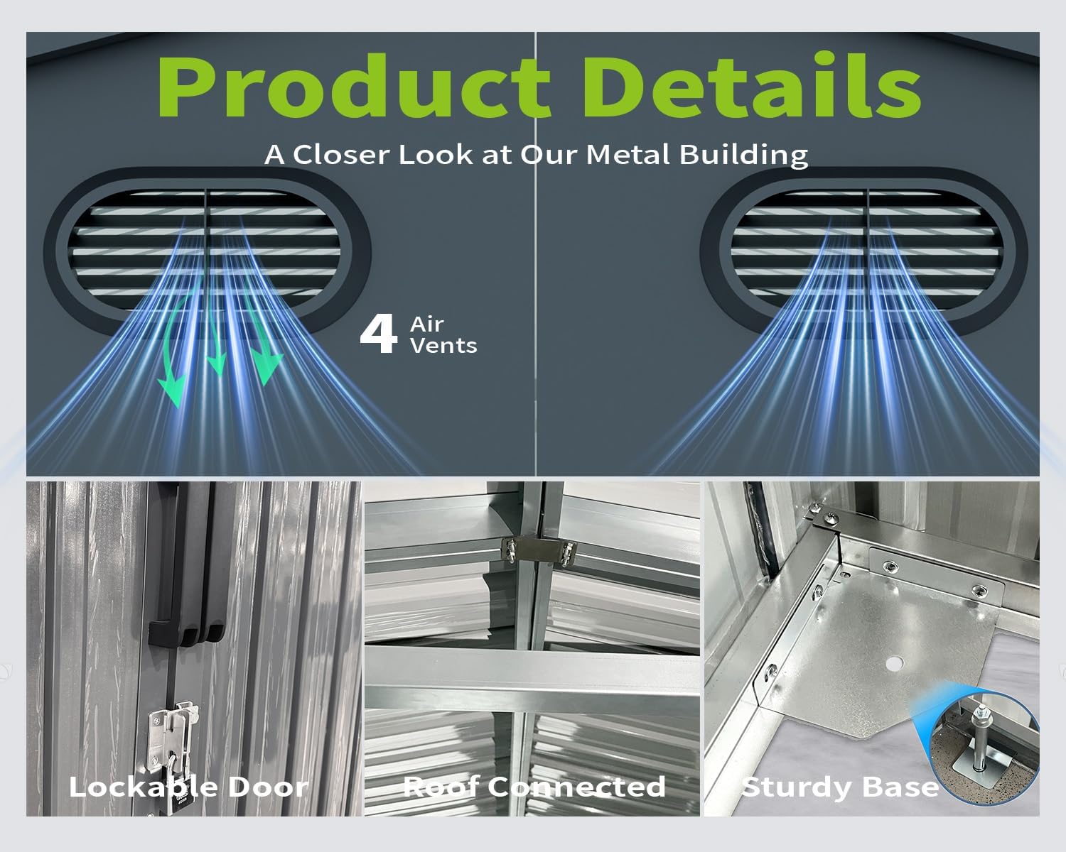 - ๐ก ๐๐๐๐ญ๐ก๐๐ซ-๐๐๐ฌ๐ข๐ฌ๐ญ๐๐ง๐ญ ๐๐๐ญ๐๐ฅ ๐๐ก๐๐: This expansive outdoor storage shed is built to be waterproof with a sloped roof that efficiently prevents water leakage or accumulation from intense rain or snow. It has four vents to improve air circulation, preserving the condition of your tools. The shedโs sloping roof and lockable door help to eliminate odors and lessen moisture, and it includes a lock for concealed storage.