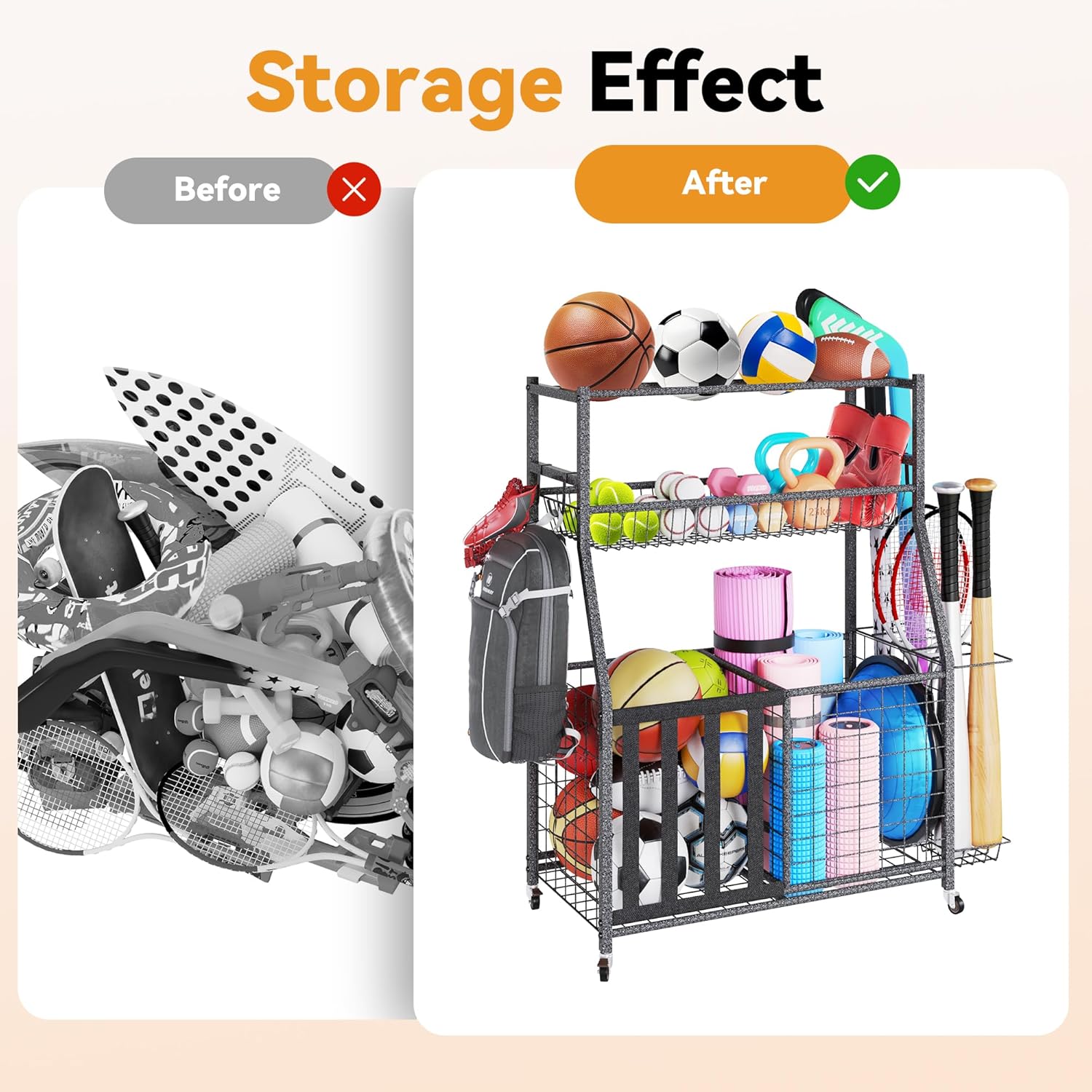 - ใ๐๐ฎ๐ฅ๐ญ๐ข๐ฉ๐ฅ๐ ๐๐๐๐๐ฌ๐ข๐จ๐ง๐ฌ ๐๐จ๐ซ ๐๐ฌ๐ใThis sports multifunctional storage organizer is perfect for placing in your garage, basement, storage room, room, bedroom, gym, school, and any workplace in your home. Not only can it hold children's basketballs, soccer balls, rackets, toy guns, but it can also hold helmets, backpacks, skateboards, shoes, and more. It can help you improve space utilization, make your home space tidy and orderly, and also facilitate your retrieval of items at any time