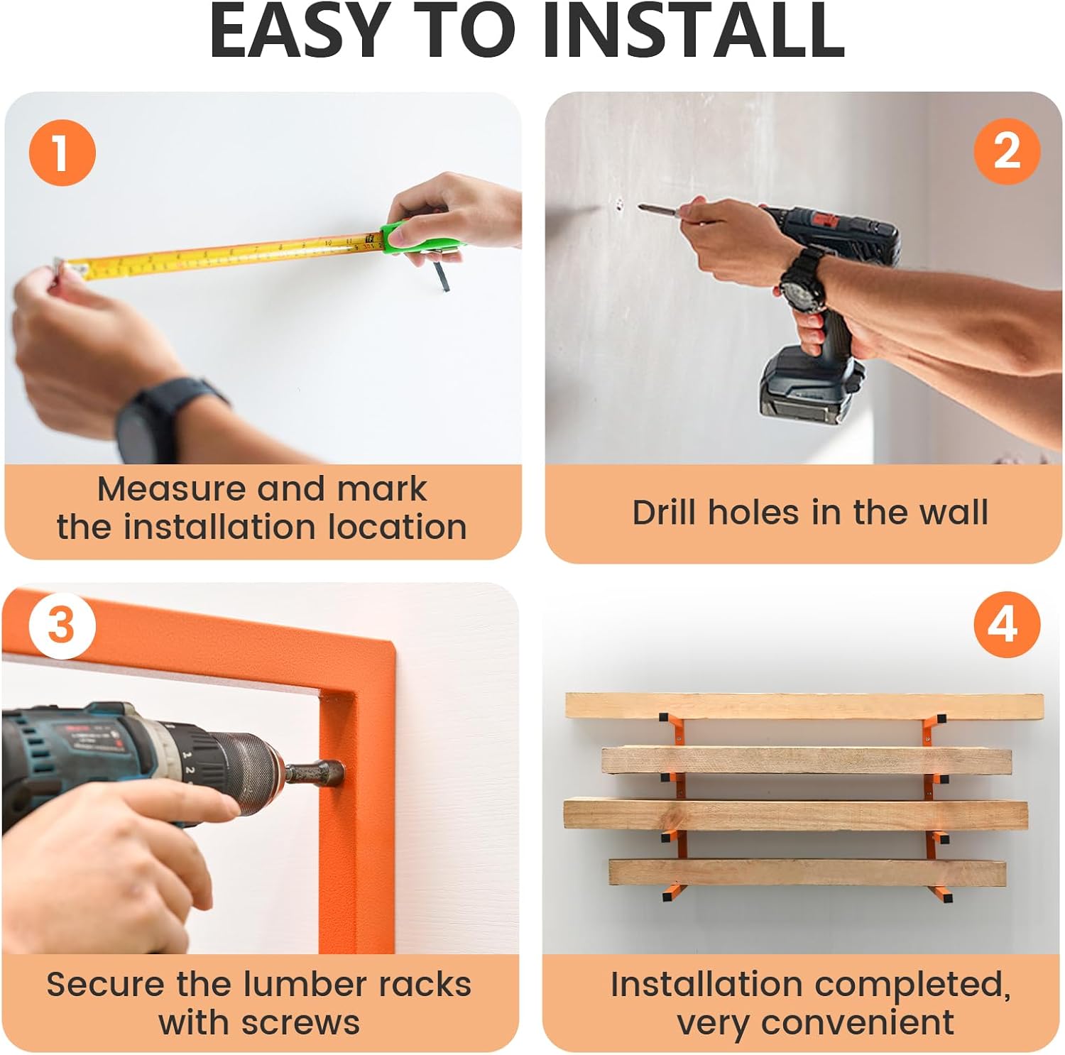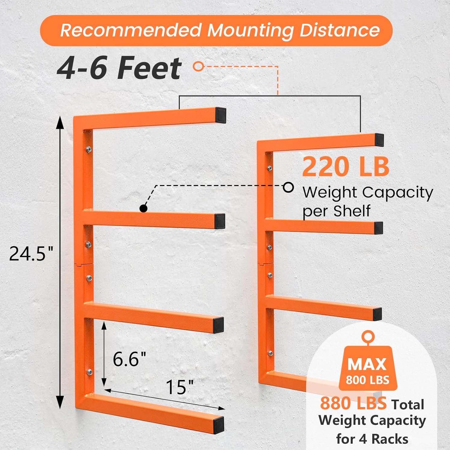 - [Heavy Duty Lumber Storage Rack]: Our wood storage shelves can be mounted on a variety of wall materials, such as concrete walls, wooden walls, red brick walls, etc. Two racks in a group, each shelf can hold 220 pounds, a total of 880 pounds, the load capacity is excellent, can meet your daily needs.