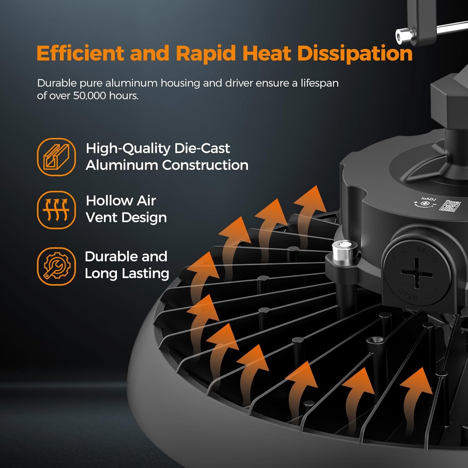 - Advanced Cooling, 60,000-Hour Lifespan: Engineered with die-cast aluminum housing + isolated driver design, our LED high bay lights utilize hollow airflow technology to prevent overheating, ensuring stable brightness and 12+ years of runtime (12hrs/day). and reduces energy costs by up to 90% compared to 800W metal halide or sodium vapor lights. Reliable, low-maintenance performance for long-term use.