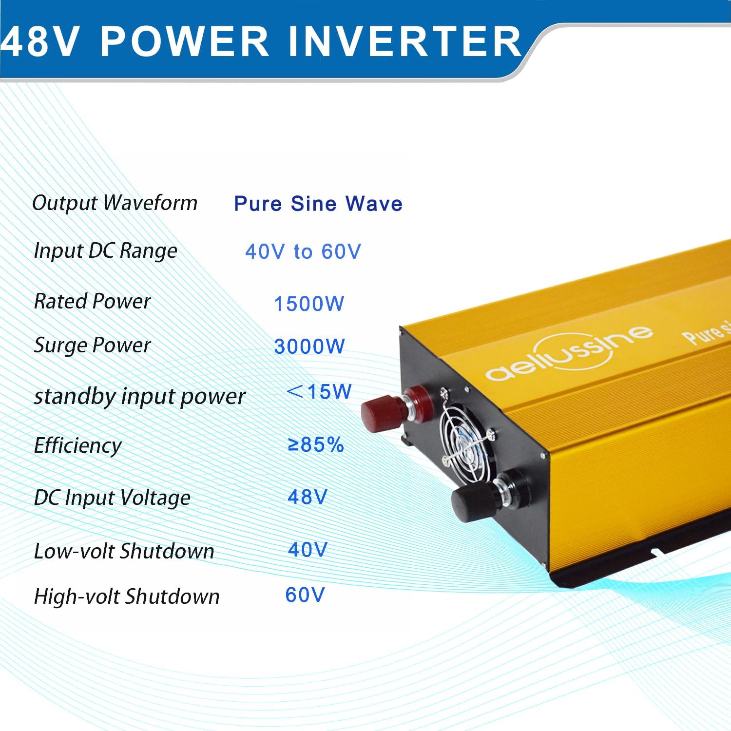 - 【pure sine wave inverter】Smooth and perfect sine waveform, just the same as home power/city power, Provide max 1500 watt continuous power and 3000 watt peak power at 60Hz frequency, power your 110v 120v ac appliance with a 48v power battery bank (battery voltage 40v to 60v is acceptable)