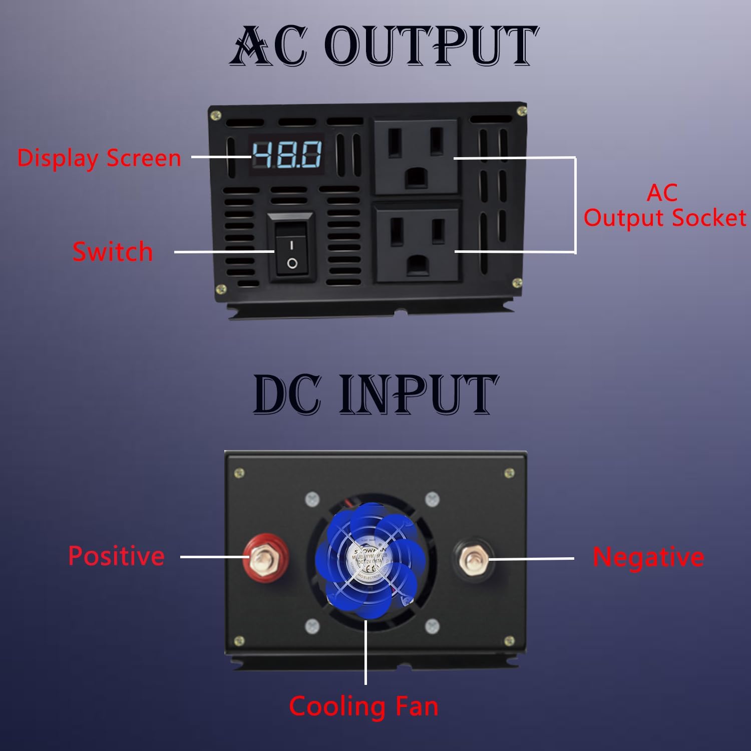 - Fully Safety Protections:The pure sine wave inverter has high efficiency and stable performance. It has sound protections including overload protection,over current protection, short circuit protection, battery reverse connection protection, high temperature protection, high or low battery input protection, built-in fuse protection.