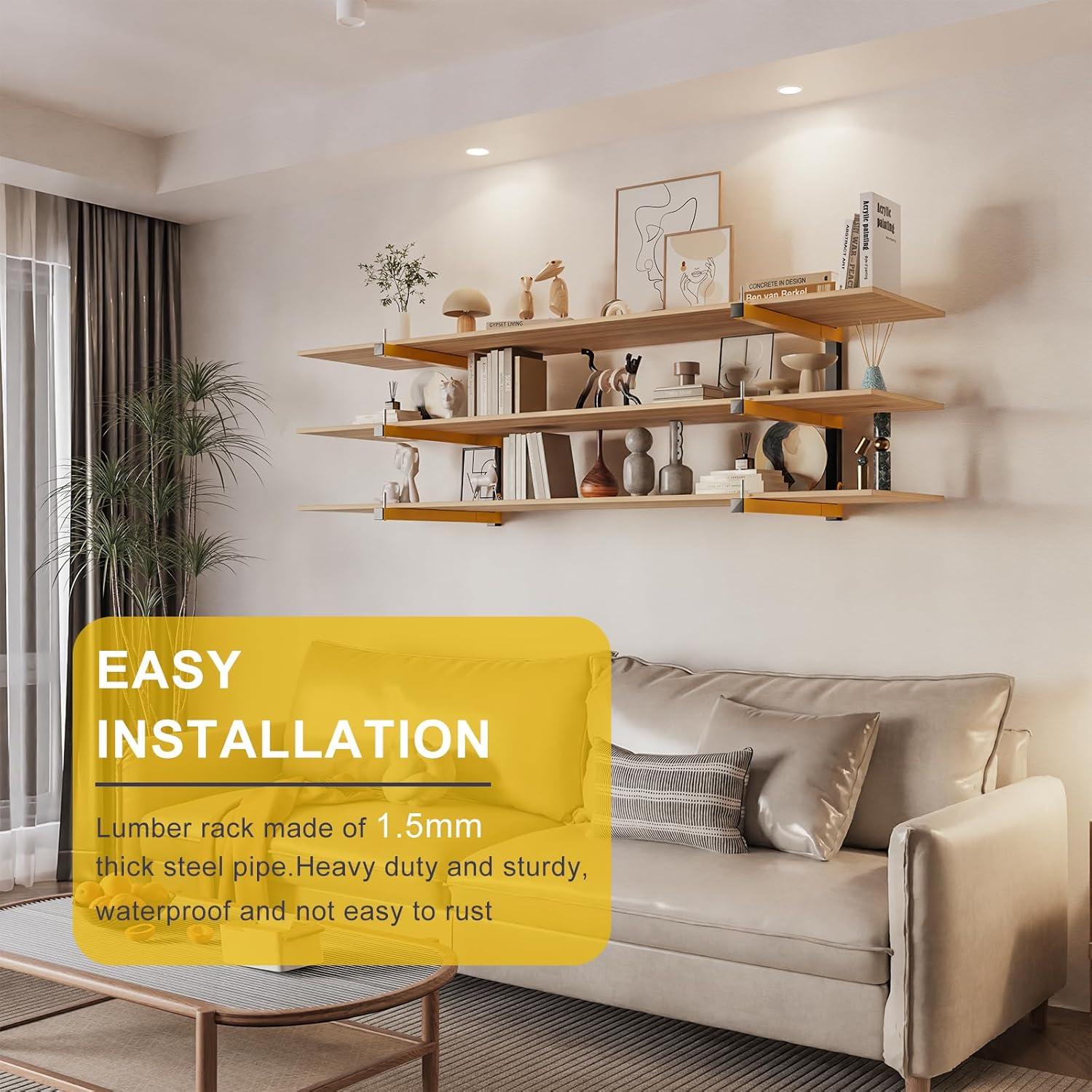 - 3-LAYER WALL-MOUNTED WOOD RACK: Heavy Duty Wood Storage Shelves for organizing the garage is welded with industrial precision and equipped with drywall anchors and high-strength screw kits. The wooden storage rack orange arm is 16 inches long. Suitable for various walls, such as concrete walls, wooden walls, red brick walls, etc.