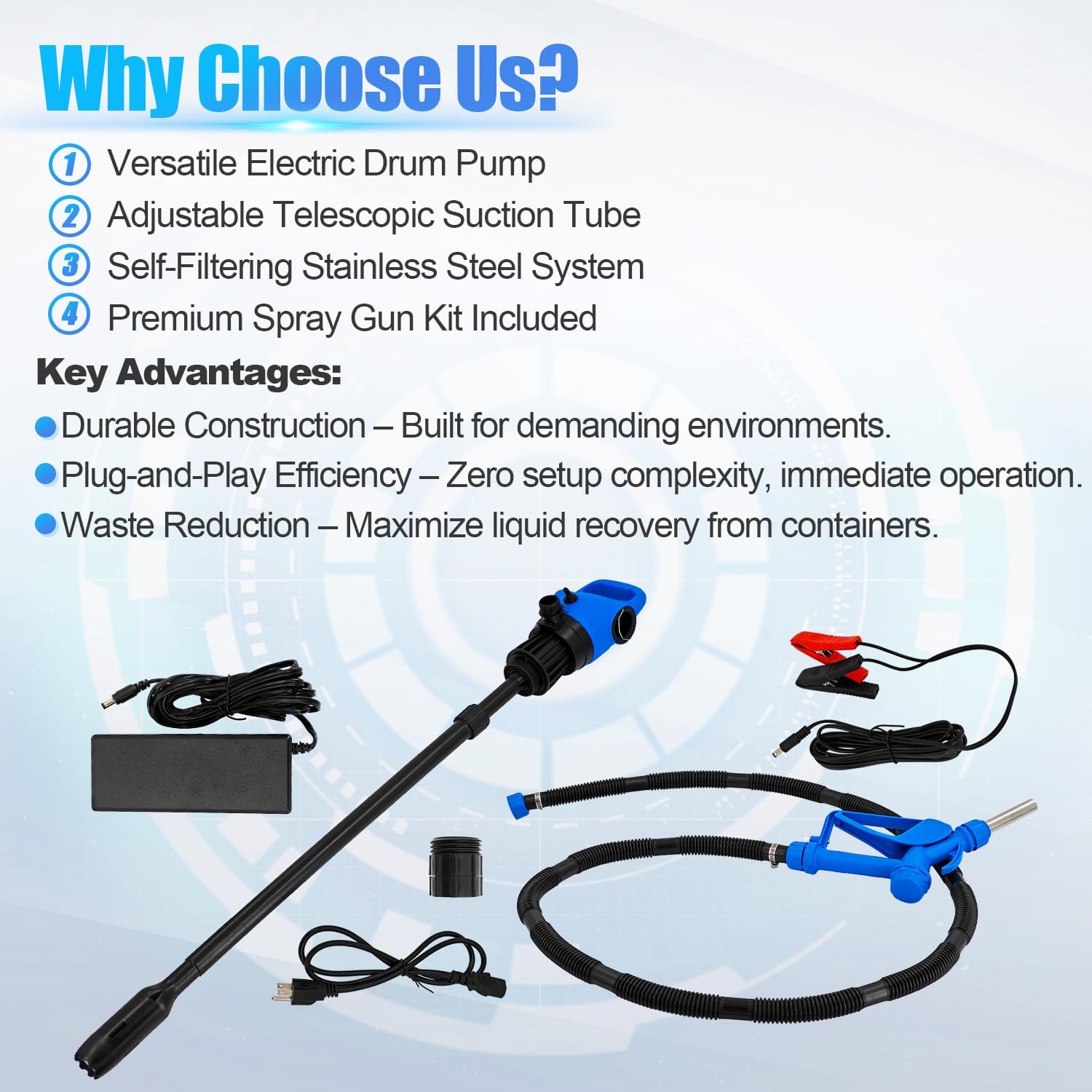 - [Adjustable & Safe]: The telescopic suction tube extends from 33.5 inches to 49 inches for compatibility with 55-gallon drums and 330-gallon IBC/totes, while a built-in fuse provides overload protection for safe usage