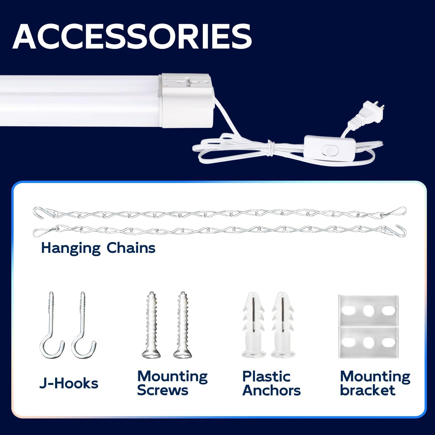 - โ Easy Installation - Plug & Play. Come with 59" power cord with on/off switch and other small accessories. You can hanging it with the included hanging chains or directly mounted to the ceiling with the included mounting screws.