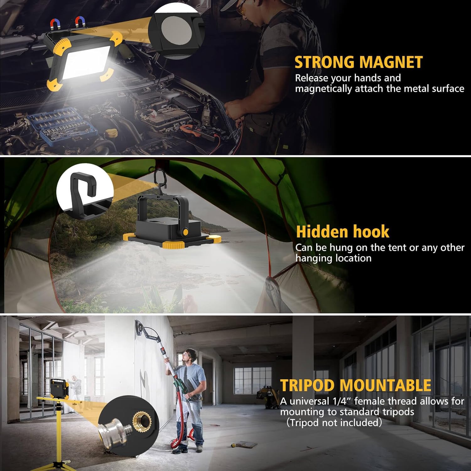 - ✨【Hook/Strong Magnetic Base & Wide Applications】 Our magnetic rechargeable led work lights come with a built-in strong magnet that attaches to metal surfaces and can be fixed to a car to provide temporary lighting. The 180° rotating stand ensures oriented lighting and stable support, while the hidden hook allows the work light to be hung from objects such as a tent. There is also a screw port on the base of the light. You can connect the light to a tripod via the screw port. This working light is ideal for use in construction sites, car repair workshops, garages, factories, interior renovations, barbecues, family lighting, parties and courtyard lighting. (NOTE: Tripod Not Included.)