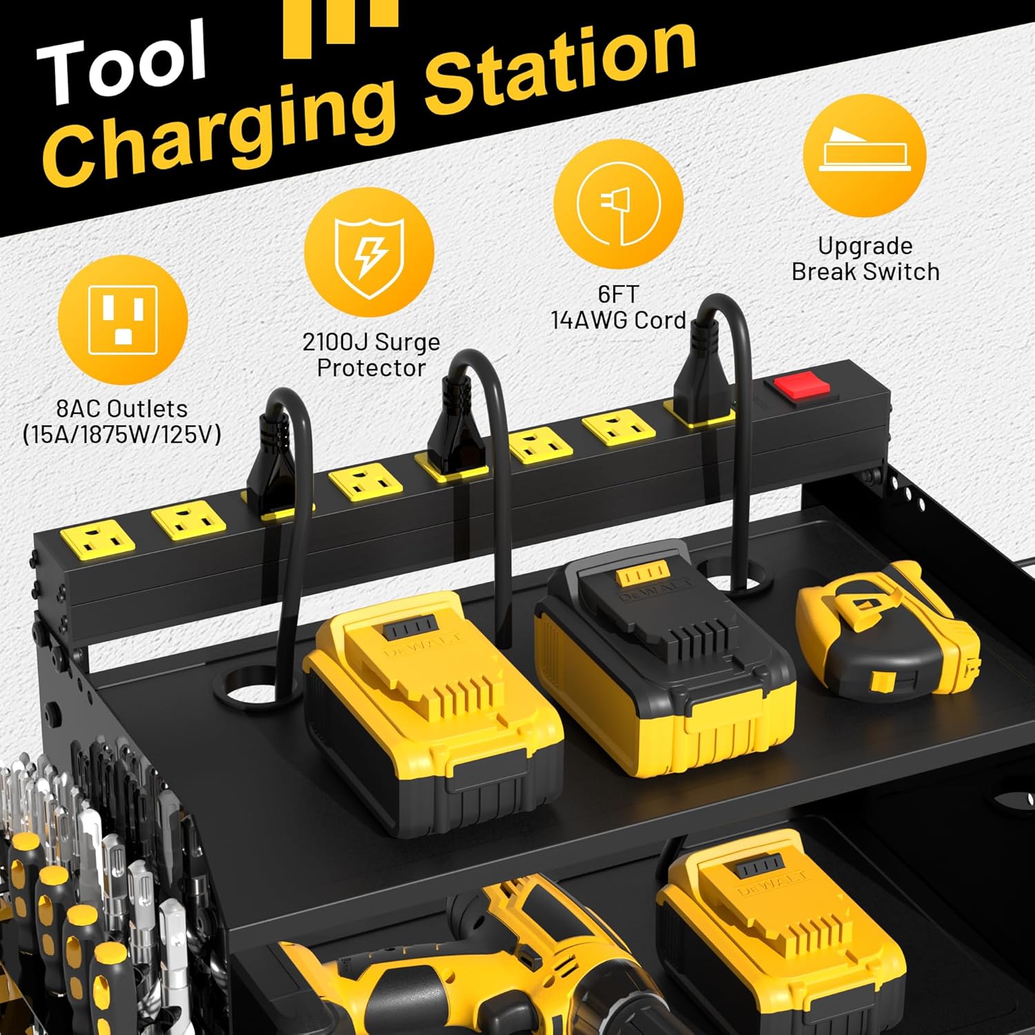 - TOOL CHARGING STATION:8 outlets power strip for power tool organizer solves the power needs,with 125V/15A/1875W,6ft power cord and 2100J surge protection to protect power equipment;Drill holes in single-layer boards to solve power cord clutter problems