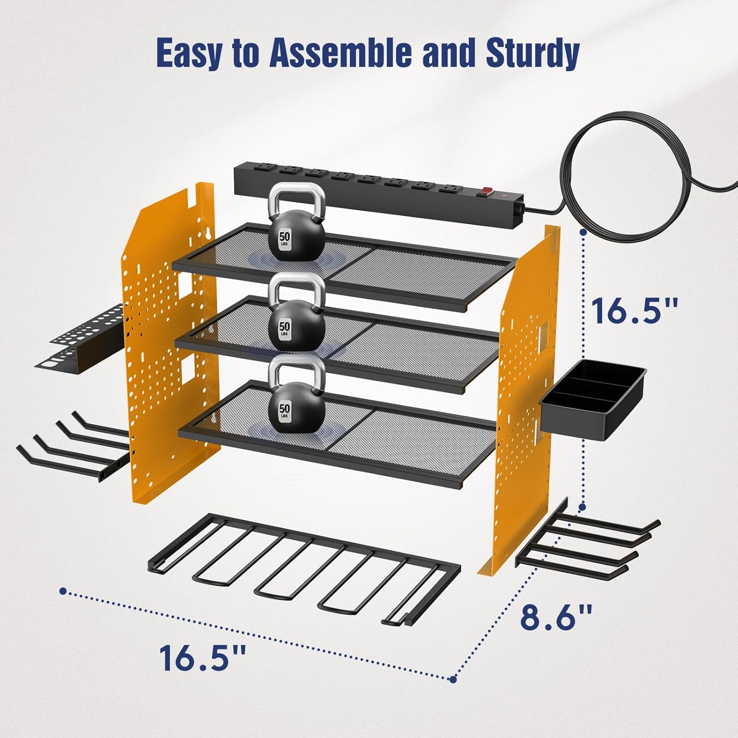 - 【4-Layers Wall Mount Tools Organizer】Power tools organizer comes with 4 drills, 2 hooks, screw & screwdriver organizer, built-in metal power strip. The 4-layer rack can accommodate more tools, and the wall mount design ensures tools storage in the work area and saves your bench space.