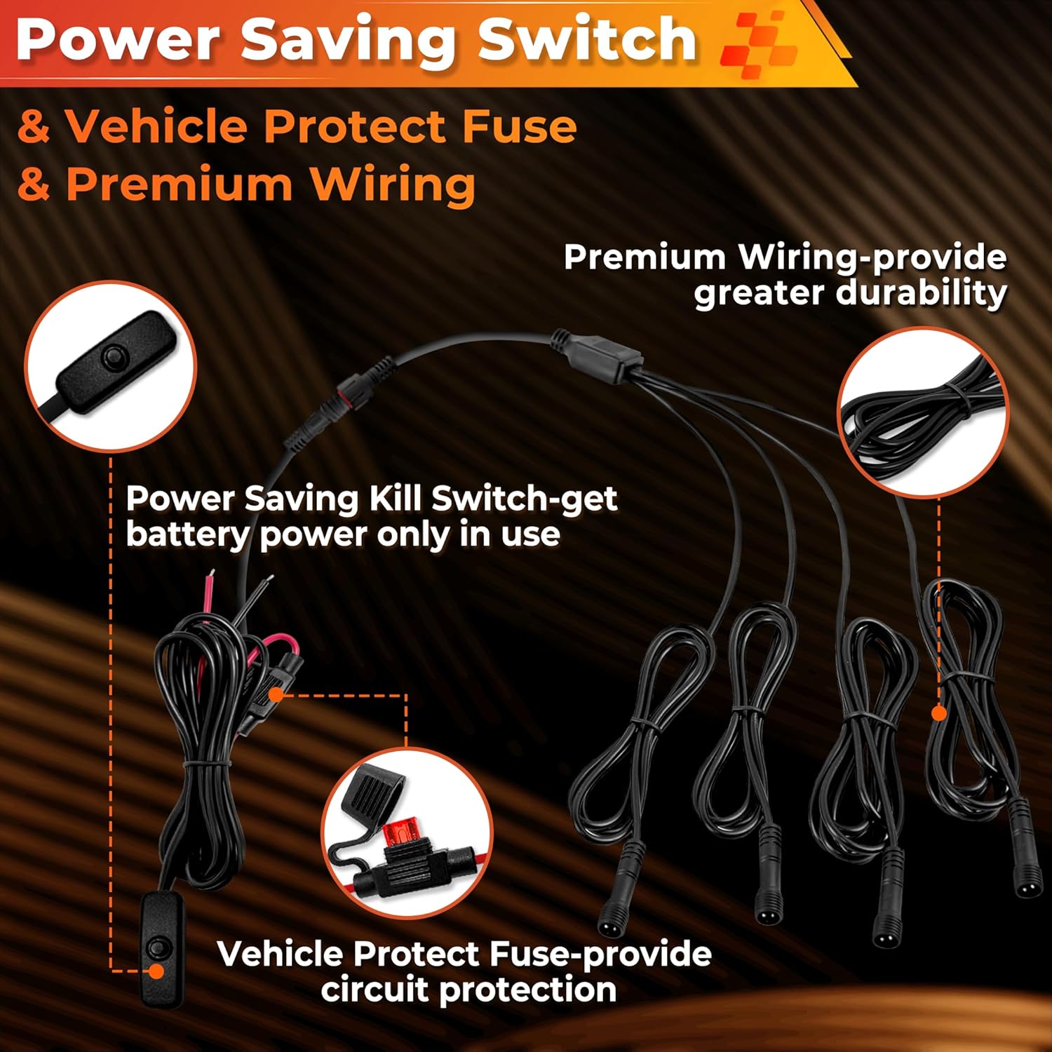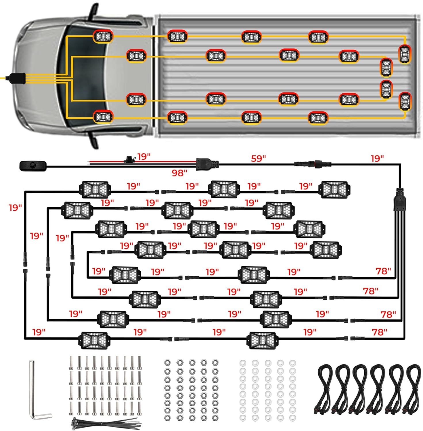 - ăConvenient Wiring Harness ConnectorăOur utv rock lights come with specialized wiring harness connectors (splitters) designed for easy connection to each pod light