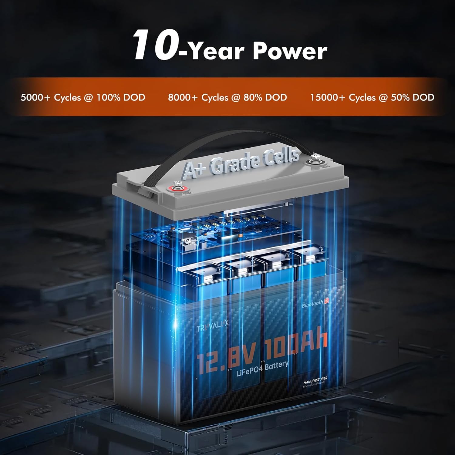 - ăPERFECT LEAD-ACID REPLACEMENTăThe TRUVALUX 12 volt 100Ah lithium battery uses premium Grade A LiFePO4 cells for higher energy density and stronger power output. It delivers over 5,000 deep cycles at full capacity and lasts more than 10 yearsâfar outperforming traditional lead-acid, sealed, or flooded batteries, which typically last only 3 years with just 200â500 cycles. With TRUVALUX, youâre not just upgrading your power â youâre saving money in the long run