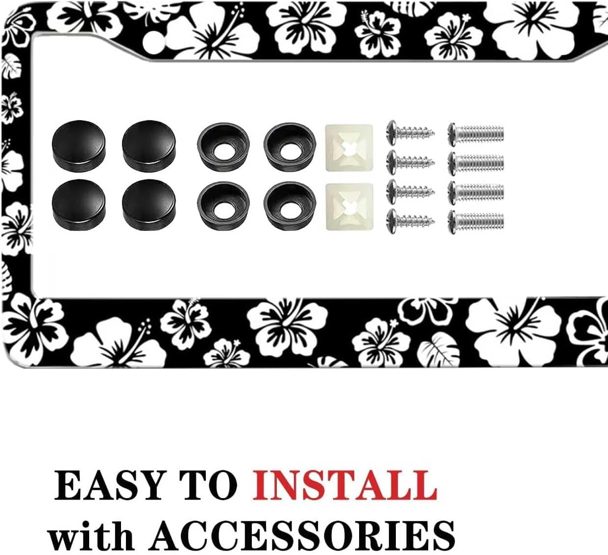 - DURABLE CONSTRUCTION: Made from premium quality metal with weather-resistant coating.Rain or Shine, Stay Secure – Our Rust-Proof Black and White Hibiscus Floral License Plate Frame Won’t Budge at Any Speed!