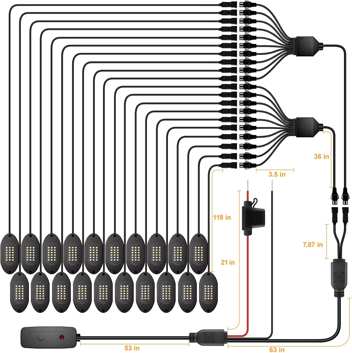 - ă118 inch WireăExtend the cable of each pod to 118 inches. If these wires are not long enough, please search for ASIN: B0DLSL74CC on Amazon to add more, this extension wire is plug and play, specifically compatible with Honalia white rock lights for trucks