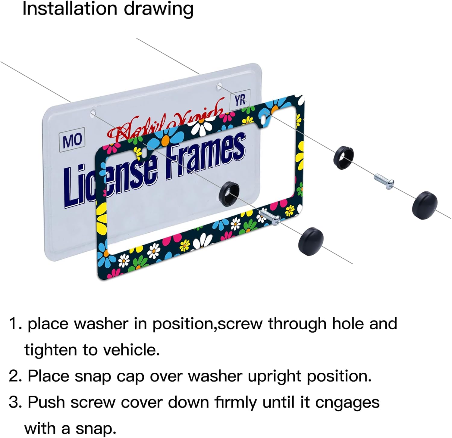 - License Plate frames Hippie:You will receive a set of 2 license plate frames,All Accessories Needed are Included (4 Screw Caps,4 Screws,4 Washers),Quick and Simple Installation,you don’t need to buy any other hardware or fasteners,Anti-theft caps are also included.