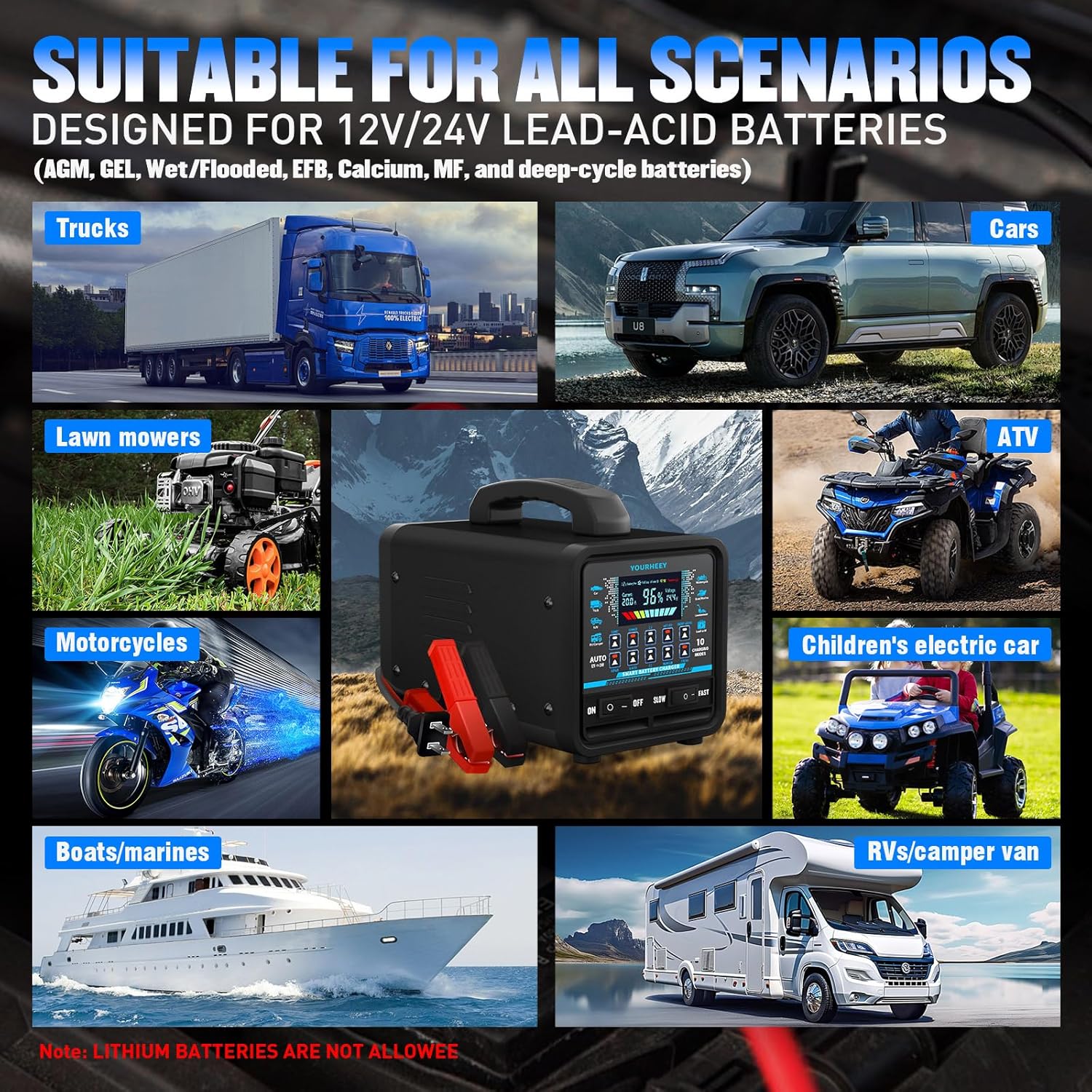- 【Professional-Grade Battery Charger】Engineered with military-grade 13.1LB pure copper coils and heavy-duty aluminum alloy casing, the Yourheey Car Battery Charger delivers unmatched durability and 30% faster heat dissipation. This 12V 24V Battery Charger Automotive masterfully handles all lead-acid battery types - AGM, GEL, Flooded, EFB, Calcium, MF, and deep-cycle batteries (Note: Not compatible with lithium/LiFePO4). Its 20A max output ensures rapid charging for trucks/RVs while maintaining precision for motorcycles/lawn equipment. car battery charger heavy duty battery maintainer trickle charger